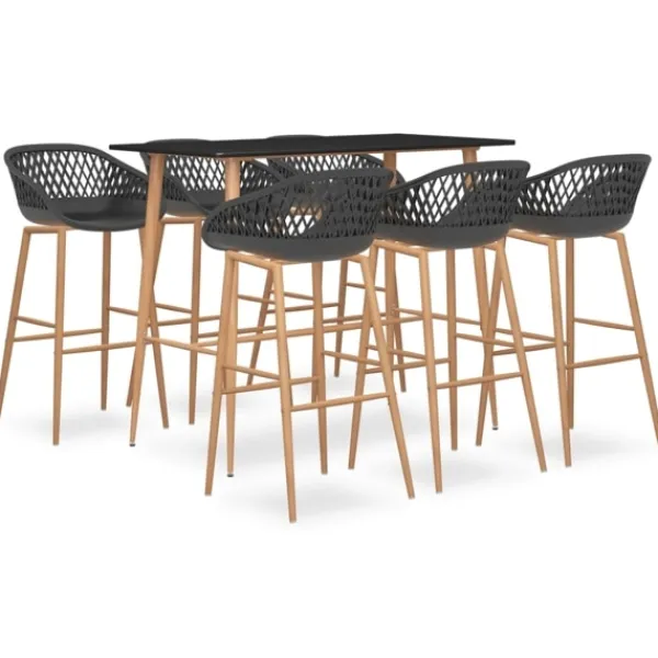 Denna bargrupp med modern design passar in i moderna hem, trädgårdar, barer eller restauranger. Dess stilrena och samtida design kompletterar din inredning. Vårt barbord har en hållbar bordsskiva i MDF och starka metallben med träutseende. Barstolarna har en ergonomisk sits med integrerat lågt ryggstöd med meshdesign. De är tillverkade av PP och stöds av starka metallben med träutseende, vilket gör stolarna robusta och hållbara.