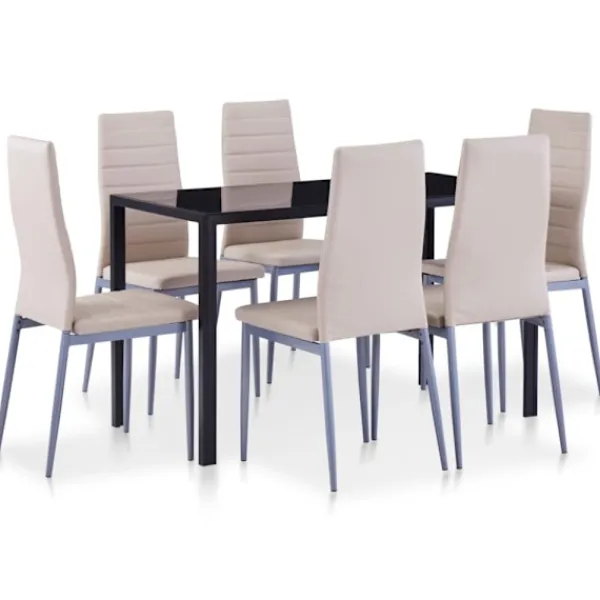 Denna svarta matgrupp i 7 delar har en elegant och modern design och det är perfekt för dem som både vill ha komfort och elegans i sin matsal eller kök.