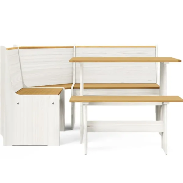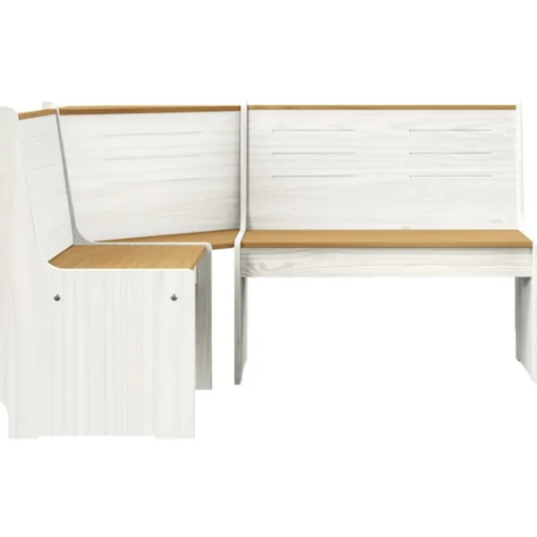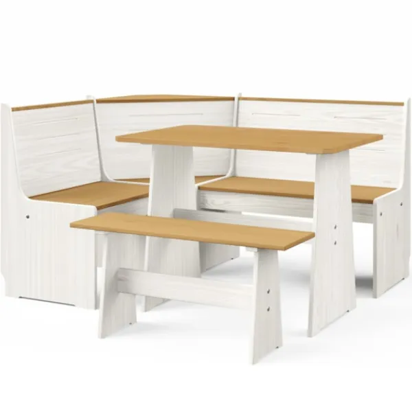 Matgruppen är tillverkad av massiv furu och är väldigt hållbar. Ryggstödet på hörnbänken bidrar till dess sittkomfort. Dessutom kan bänken monteras både vänstersidigt och högersidigt för att passa olika layouter. Bordet är perfekt för att placera måltider och drycker. Den används för avslappnade middagar eller som ett bra ställe att göra läxor.