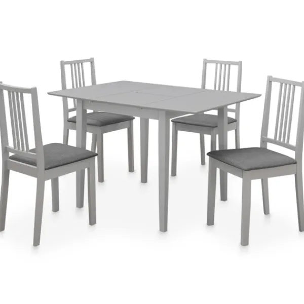 Denna matgrupp i 5 delar har en tidlös och slitstark design och blir en elegant detalj i din inredning. Det utdragbara matbordet och stolarna är tillverkade i massivt gummiträ och är väldigt stabila och hållbara. Tack vare sin unika design kan bordet förlängas när du behöver mer utrymme. Stolarnas ryggstöd och dynor har en bekväm sittupplevelse. Matgruppen är lätt att rengöra med en fuktig trasa. Matgruppen är lätt att montera. Vid leverans ingår 1 utdragbart bord och 4 stolar.