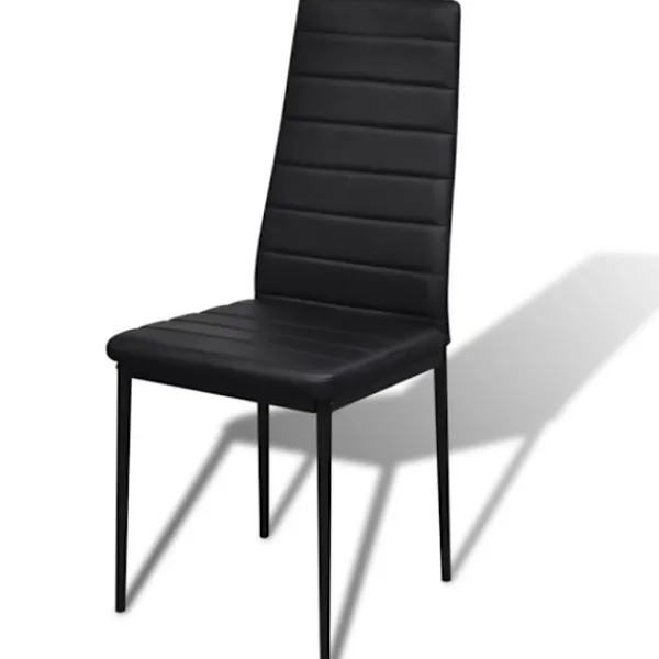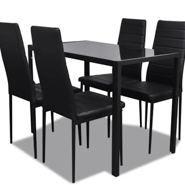 Bordsskivan är tillverkad av starkt, härdat glas som är enkelt att rengöra. Varje stol är klädd med konstläder. Den spänstiga, vadderade sitsen är väldigt bekväm.