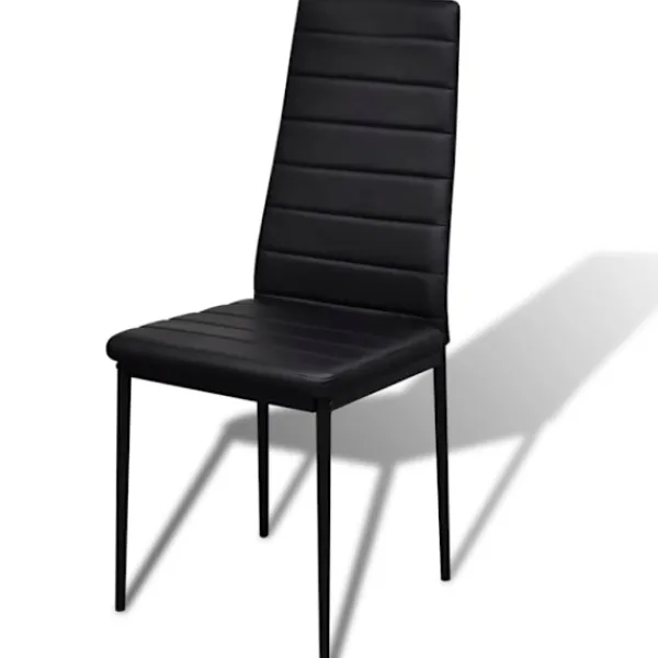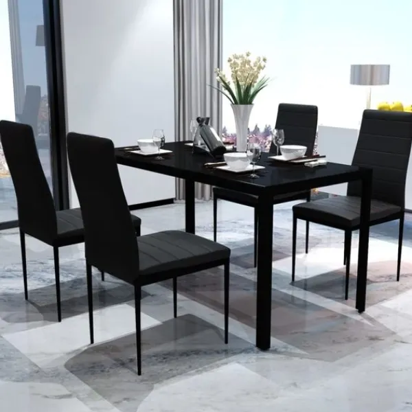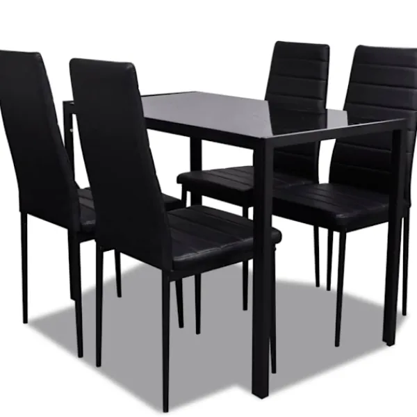 Detta svarta matbordsset, har en elegant och modern design, det är perfekt för dem som vill ha både komfort och elegans i sin matsal eller sitt kök.// Bordsskivan är tillverkad av starkt, härdat glas som är enkelt att rengöra. Varje stol är beklädd med konstläder. Den spänstiga, vadderade sitsen är väldigt bekväm. Vid leverans ingår 1 bord och 4 stolar.