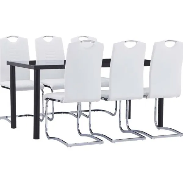 Vår matgrupp har en elegant och modern design och passar perfekt i moderna hem, matrum eller kommersiella restauranger. Dess stilrena och moderna design kommer att komplettera din inredning. Bordet har en slät bordsskiva i härdat glas som är enkel att rengöra med en fuktig trasa. Den pulverlackerade metallramen bidrar till dess massiva konstruktion och gör den mycket stabil och hållbar. Stolarna är klädda i mjukt konstläder och är tjockt stoppade för maximal komfort. Dess ergonomiska design gör matstolen mycket bekväm att sitta på. Tack vare den kromade stålramen är stolarna robusta och stabila. Dessutom har stolarna ett handtag i ryggstödet så att de enkelt kan flyttas. Matgruppen är enkel att montera. Vår matgrupp är perfekt när du bjuder in familj och vänner på middagsbjudningar.
