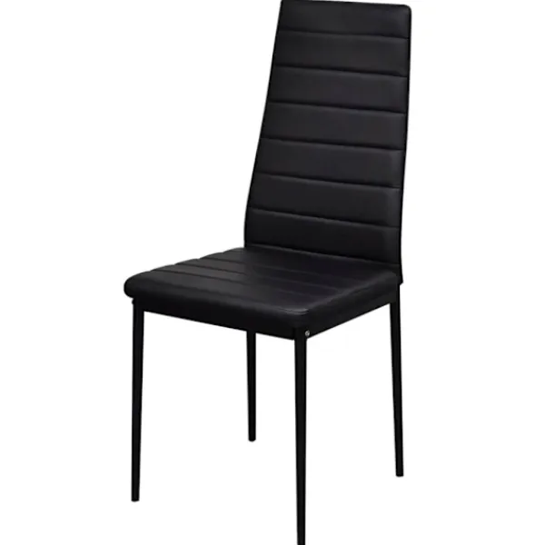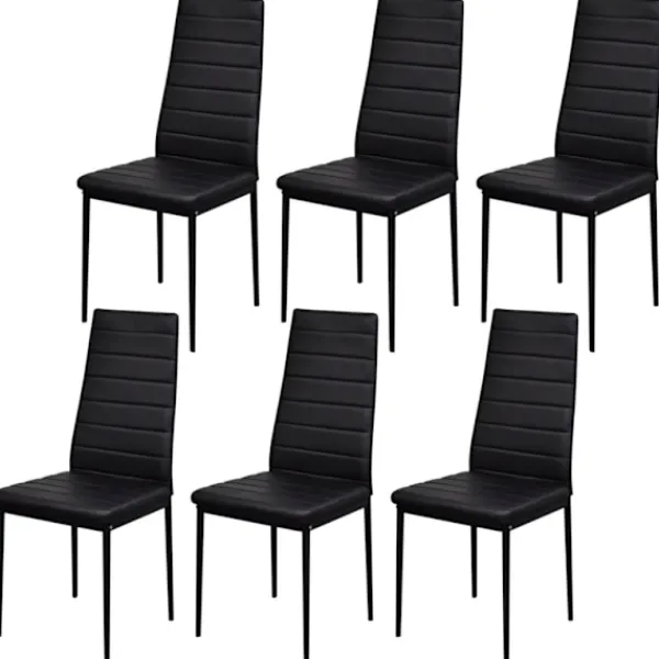 Detta svarta matbordsset har en elegant och modern design, det är perfekt för dom som både vill ha komfort och elegans i sin matsal eller sitt kök. Bordsskivan är tillverkad av starkt, härdat glas som är enkelt att rengöra. Varje stol är beklädd med konstläder. Den spänstiga, vadderade sitsen är väldigt bekväm. I leveransen får du 1 bord och 6 stolar.