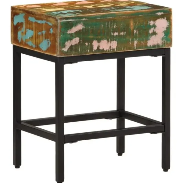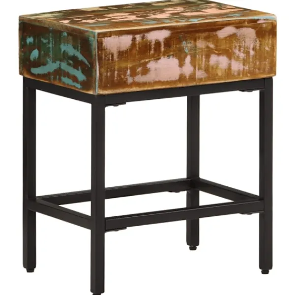 Detta eleganta och praktiska sidobord utstrålar en vintage charm och blir ett snyggt tillskott i ditt hem. Massivt återvunnet trä: Massivt återvunnet trä består av återanvänt virke som teak, mangoträ, furu och bok. Dessa träslag är återvunna från gamla byggnader som fabriker, skjul och båtar. Detta gör det till ett fantastiskt miljövänligt alternativ inom möbeltillverkning. Eftersom varje möbel är handgjord kommer färgerna att variera från möbel till möbel. Du kan se blåa eller gröna och ibland orange, röda eller rosa nyanser.Pulverlackerat järn: Tv-enhetens pulverlackerade järnram bidrar till extra stabilitet.Visningsfunktion: Bordet har en robust bordsskiva för att placera dina favoritföremål som fotoramar och krukväxter. Varning:För att förhindra att den välter måste denna produkt användas med den medföljande monteringsanordningen för vägg Observera:Färgerna kan variera från möbel till möbel vilket gör varje möbel unik. Det går inte att välja vilken just du får.