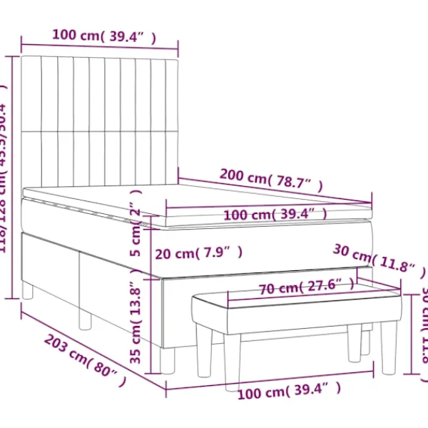 Använd denna säng med pocketresårmadrass för att njuta av en god sömn! Den ger dig maximal avkoppling och en trevlig sömn. Mjukt sammet: Sammet är ett mjukt, lyxigt tyg som känns igen på sitt täta, jämnt skurna fiber som är lämpligt att ta en tupplur på. Sammetstyg har en distinkt mjuk känsla, vilket gör det bekvämt att röra vid.Praktisk huvudgavel: Sänggaveln är justerbar i höjd enligt dina önskemål. Huvudgaveln ger dig utmärkt ryggstöd medan du sitter upp i sängen för att läsa eller titta på TV.Pocketresårmadrass: Den inbyggda individuella pocketresåren är känd för sin mycket höga kvalitet samtidigt som den säkerställer en hög hållbarhet och anpassningsförmåga. Den absorberar buller och stötar som orsakas av en orolig sömn.Medelhårt stöd: Sängmadrassen har extra stabilitet och precis rätt fasthet utan att offra komforten. Så den är ideal för personer som sover på rygg eller mage.Hudvänligt tyg: Bädmadrassen har ett slitstarkt såväl som hudvänligt tygöverdrag, vilket gör det mjukt och bekvämt.Multifunktionell bänk: Denna bänk kan fungera som en extra plats i ditt hem. Den kan också ställas framför din säng. Observera:Av hygieniska skäl kan madrassen inte returneras om förpackningen har tagits bort eller öppnats.Varje produkt levereras med en monteringsmanual i lådan för enkel montering.