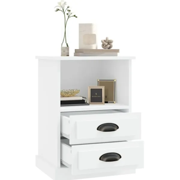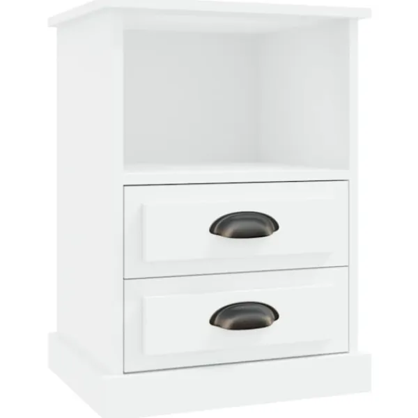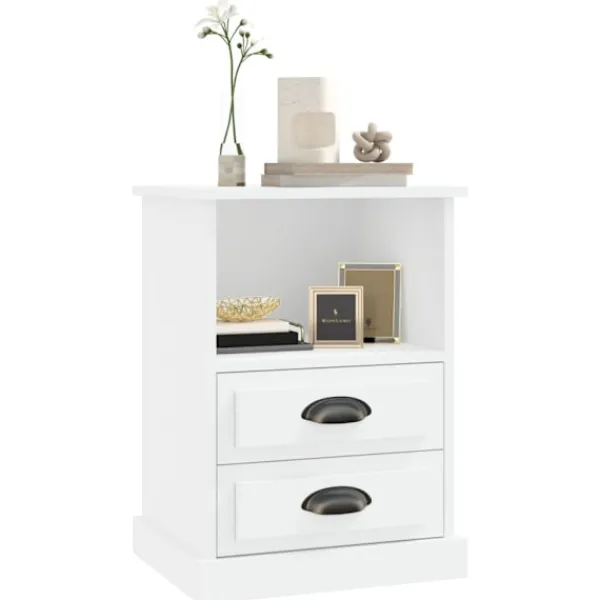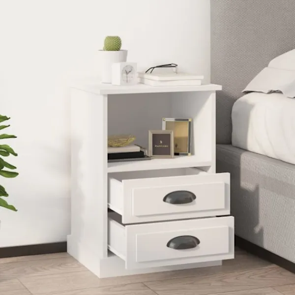 Detta nattduksbord med elegant design blir ett tidlöst tillskott i din inredning. Hållbart material: Det konstruerade träet är av exceptionell kvalitet med slät yta och är också starkt, stabilt och fuktbeständigt.Gott om förvaringsutrymme: Nattduksbordet är utformat med två byrålådor och ett öppet förvaringsutrymme för att hålla saker organiserade och inom räckhåll.Robust toppskiva: Toppskivan är perfekt för att visa upp dekorationer, foton och krukväxter. Varning:För att förhindra att den välter måste denna produkt användas tillsammans med det medföljande väggfästet.