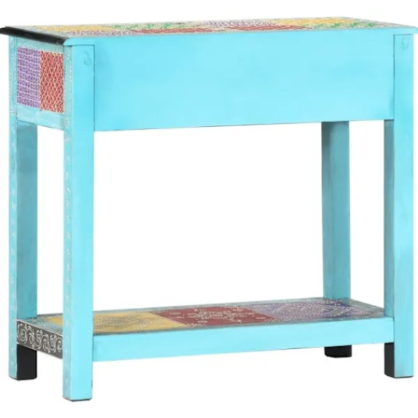 Denna unika och vackra träskänk kommer att bli en färgglad detalj i ditt vardagsrum eller sovrum och är en iögonfallande möbel. Med sin slående design kommer denna handmålade skänk att bli en konversationsstartare när du bjuder över gäster. Bordet är handgjort av mangoträ och MDF, vilket både är slitstarkt och vackert, och hantverket bidrar till den spektakulära retrostilen. Bordet har handmålade, dekorativa detaljer som utstrålar elegans och belyser det raffinerade utseendet. De distinkta handtagen gör det lättare att öppna lådorna och ger samtidigt bordet en unik stil. Skänken har 2 lådor och 1 hylla, med gott om utrymme för att hålla dina saker ordentligt organiserade. Den färgstarka skivan är perfekt för att visa upp dekorativa föremål såsom vaser, fotoalbum, fruktkorgar m.m. Skänken är enkel att montera.