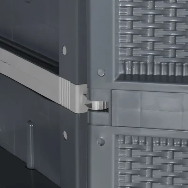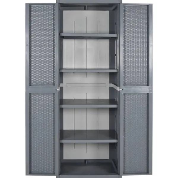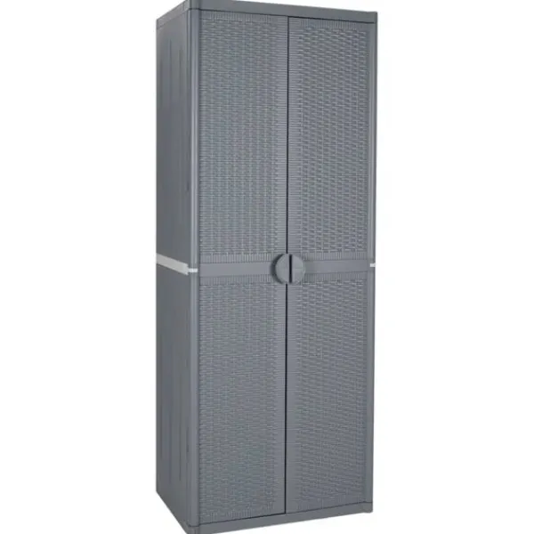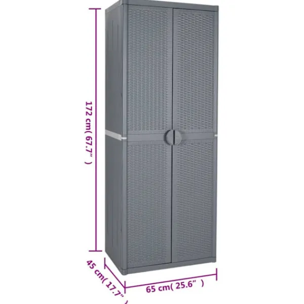 Detta förvaringsskåp har en praktisk design och blir garanterat ett blickfång i din inredning. Slitstarkt material: Skåpet är tillverkad av slitstark polypropylen. Polypropylen (PP) är en populär plast som också är ett av de mest använda materialen för utomhusprodukter. Det är lätt, slitstarkt och slagtåligt.Gott om förvaringsutrymme: Skåpet har fyra hyllor vilket ger gott om utrymme för att organisera och förvara dina viktiga föremål som textilier, tvättmedel, borstar och mera.Handtagdesign. Handtagen på dörren möjliggör enkel och snabb öppning av förvaringsskåpet. Bra att känna till:För att göra monteringen så enkel som möjligt, levereras varje produkt med en bruksanvisning.Varning:För att förhindra att den välter måste denna produkt användas tillsammans med ett väggfäste (ingår ej).
