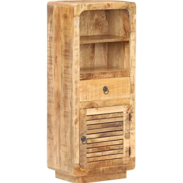 Högskåpet är tillverkat i grovt mangoträ med naturlig yta, ett tropiskt träslag som är mycket starkt. Det står även emot tidens tand, vilket gör det stabilt och hållbart. Hantverket och de vackra träådringarna gör varje möbel unik och något olik de andra. Skåpet har även en dörr, en låda och två hyllor för gott om förvaringsutrymme.