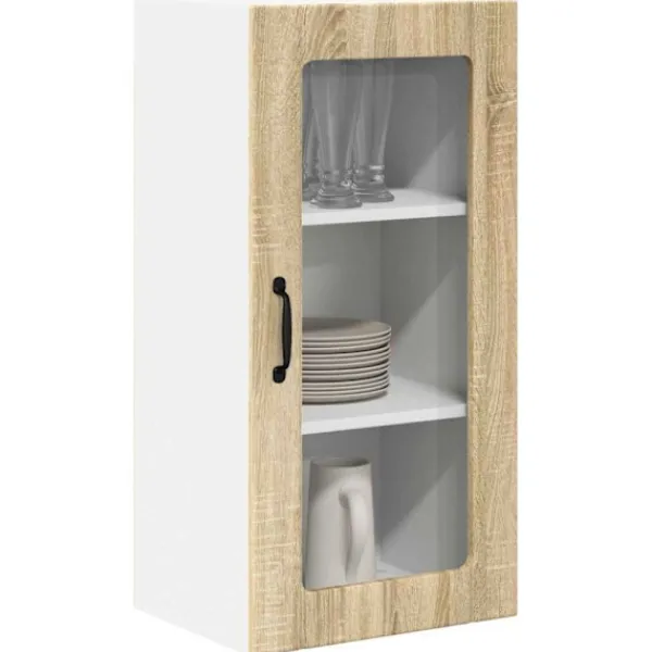 Det här träskåpet är designat i en modern stil, och passar perfekt in i dagens kök. Det konstruerade träet gör det hållbart och enkelt att använda inomhus. Med sina rena linjer och minimalistiska stil ger det en elegant känsla i varje kök. Skåpet erbjuder bra förvaring med sina smarta fack och hyllor, oavsett om du har tallrikar eller matvaror. Det smälter in med din moderna köksinredning och gör matlagningen både enklare och trevligare.