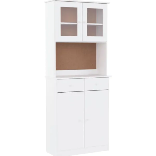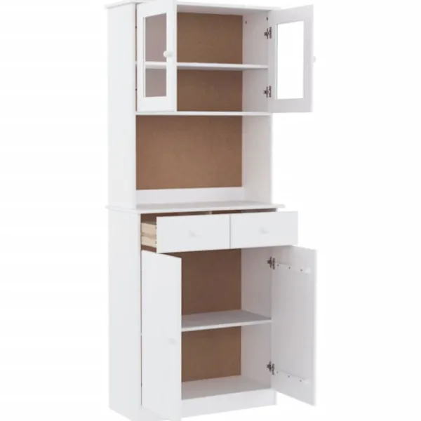 Detta vitrinskåp i trä med gott om förvaringsutrymme är ett perfekt komplement till ditt vardagsrum. Massiv furu: Massivt furuträ är ett vackert naturmaterial. Furuträ har raka fibrer, och kvistarna ger materialet en rustik utstrålning. Då det är tillverkad i massiv furu är skåpet slitstarkt och robust.Gott om förvaringsutrymme: Med hyllor, lådor och glasdörrar erbjuder högskåpet gott om förvarings- och visningsalternativ för dina favoritartiklar.Lätt att underhålla: Skåpet är lätt att rengöra med en fuktig trasa och kräver minimalt underhåll.Träknoppar: Skänken levereras med träknoppar som gör det enkelt att öppna och stänga, samtidigt som det förhöjer dess skönhet. Varning:För att förhindra att den välter måste denna produkt användas tillsammans med det medföljande väggfästet.