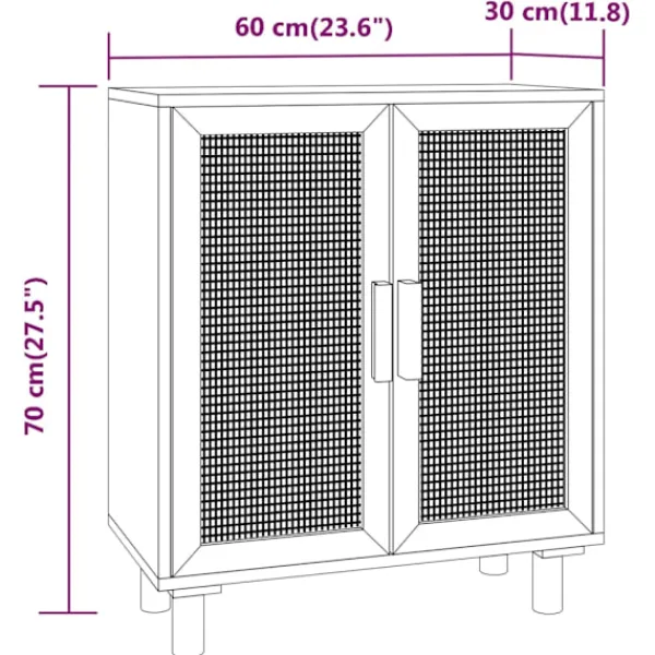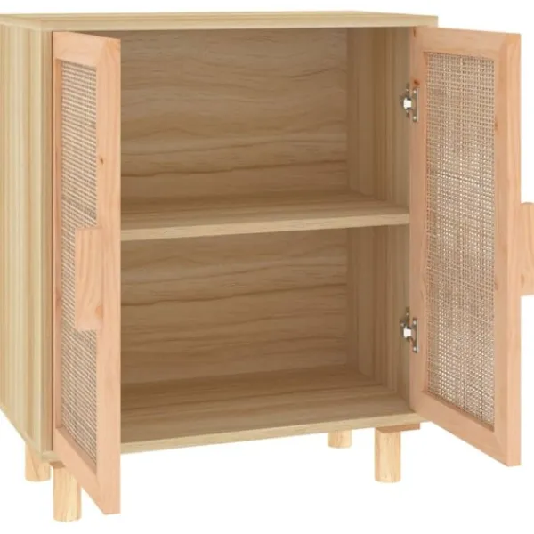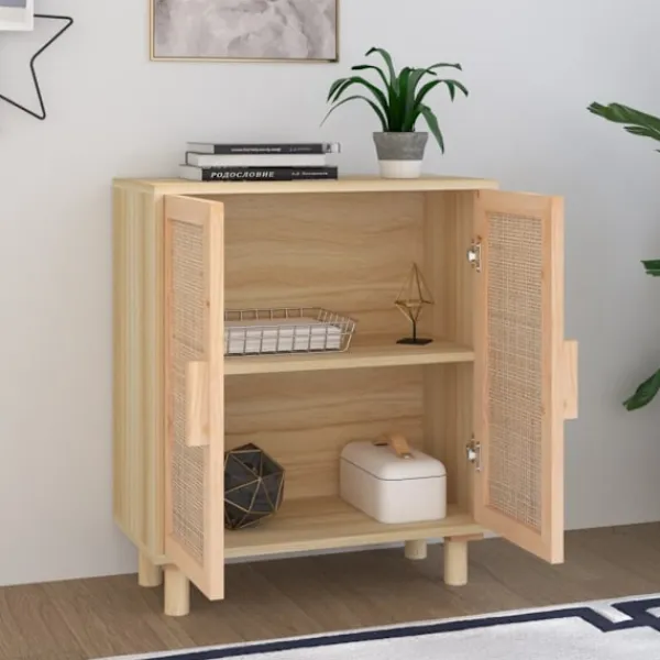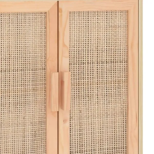 Denna skänk i trä uppfyller dina olika krav och blir ett perfekt tillskott i ditt rum. Hållbart material: Det konstruerade träet är av exceptionell kvalitet med slät yta och är också starkt, stabilt och fuktbeständigt.Gott om förvaringsutrymme: Skåpet är utrustat med 2 utrymmen med gott om förvaringsutrymme för att hålla dina olika dagliga saker välorganiserade och inom räckhåll. Dessutom är den fin tack vare dess dörrar i naturlig rotting.Fötter i massiv furu: Träfötterna ger skänken ett naturligt och behagligt utseende samtidigt som stabiliteten säkerställs. Den smälter in med vilken inredning som helst.Robust ovansida: Du kan också placera dina favoritfoton, dekorationer eller blommor ovanpå skåpet för att berika ditt rum. Observera:Varje produkt levereras med en monteringsmanual i lådan för enkel montering. Varning:För att förhindra att den välter måste denna produkt användas med den medföljande monteringsanordningen för vägg
