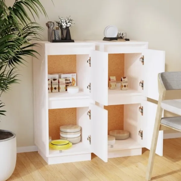 Dessa träskänkar är ett dekorativt såväl som praktiskt komplement till din befintliga inredning. Dessa skänkar är tillverkade i massiv furu och MDF, vilket garanterar dess robusta och hållbara konstruktion. Skåpet har 2 dörrar med gott om förvaringsutrymme för böcker, multimediaapparater och andra föremål. Den stadiga bordsytan är perfekt för dekorativa objekt såsom inramade foton, krukväxter eller en vas. Dessutom har skänkarna en fin design.