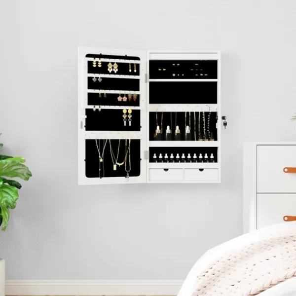Förvara dina smycken och parfymer diskret och elegant förvarade med detta snygga spegelskåp med LED-lampor! Hållbart material: Det konstruerade träet är av exceptionell kvalitet med slät yta och är också starkt, stabilt och fuktbeständigt. Skåpet är tillverkad av konstruerat trä och är lätt att rengöra med en fuktig trasa.Gott om förvaringsutrymme: Förvaringsspegeln har 2 lådor och massor av krokar, hängare och hyllor för att hålla dina smycken snyggt organiserade och inom räckhåll.Praktisk spegel: Spegeln gör detta skåp perfekt för att göra sig redo och sminka sig.Hänsynsfullt skydd: Spegelskåpet har en låsbar dörr och levereras med 2 nycklar för att säkerställa säkerheten för dina föremål. Dessutom är det mjuka tygöverdraget inuti inte bara snyggt utan skyddar också dina älskade smycken från repor.Praktiska LED-lampor: Längst upp på insidan tänds LED-lamporna automatiskt när luckan öppnas, vilket gör det lättare för dig att hitta dina smycken.Platsbesparande design: Häng spegelskåpet över dörren med de medföljande krokarna eller montera den på väggen för att spara golvyta. Bra att känna till:Skruvar för väggmontering ingår.3 AA-batterier krävs men ingår inte i leveransen.