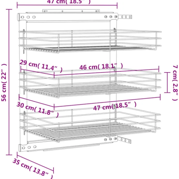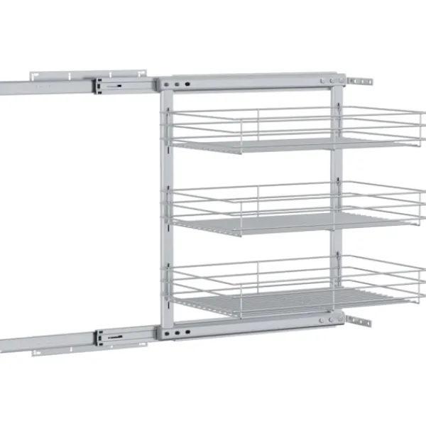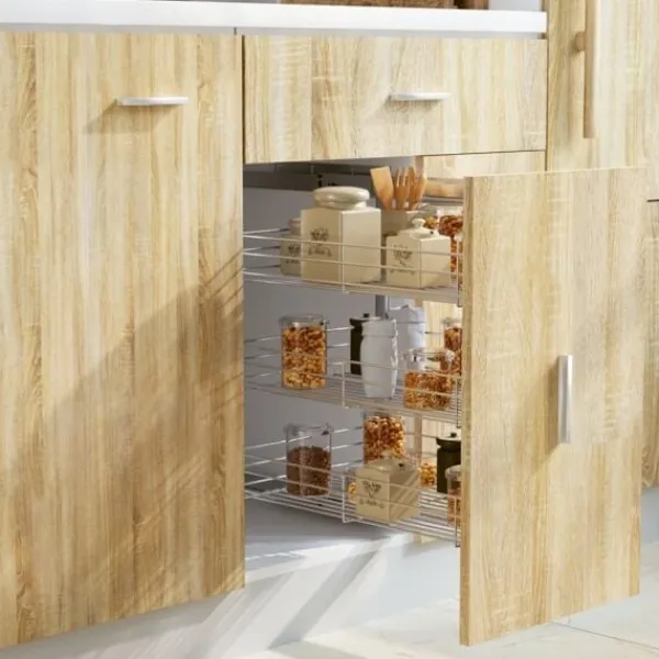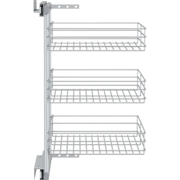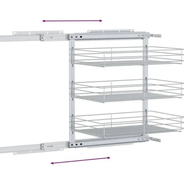 Vår utdragbara inredning är enkel att installera i ditt köksskåp med de medföljande monteringstillbehören. Den är utrustad med 3 hyllor och presenterar en enkel och praktisk lösning för att optimera ditt förvaringsutrymme i köket. Eftersom den är tillverkad i elektropläterad tråd utstrålar den en ren och modern charm och är samtidigt väldigt hållbar. Dessutom går den väldigt tyst tack vare dess skenor.