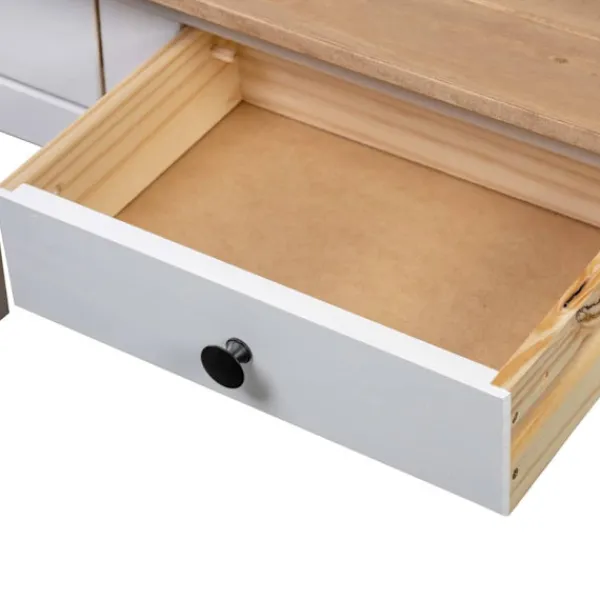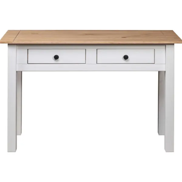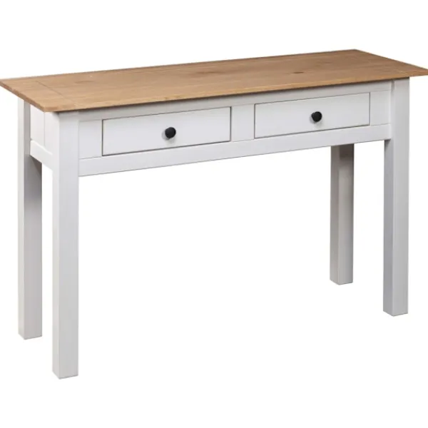 Detta konsolbord i trä har en enkel men stilig design. Det kommer att ge din inredning en rustik charm. Avlastningsbordet är skickligt tillverkat i massiv furu och är väldigt robust och hållbar. Tack vare dess kompakta design kan du enkelt hitta en plats för vårt avlastningsbord nästan var som helst. Den stadiga bordsskivan är perfekt för att visa upp dekorativa föremål, fotoramar eller krukväxter. De 2 lådorna ger extra förvaringsutrymme för småsaker. Det kan även användas som sidobord, avlastningsbord, skänk, osv. Produkten är enkel att montera.