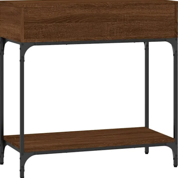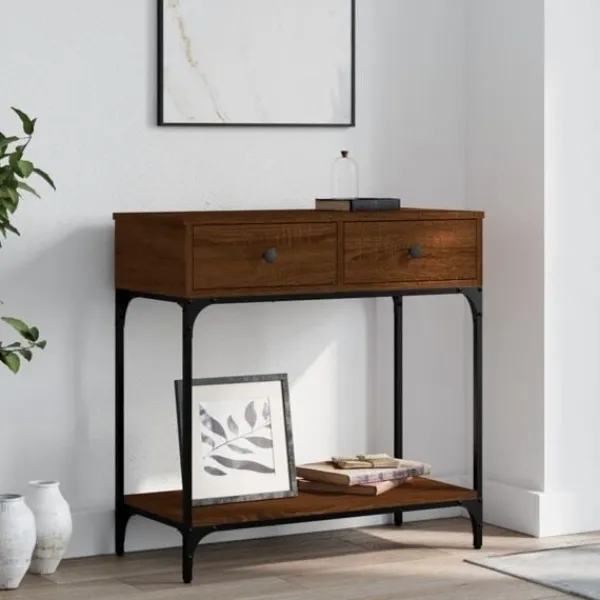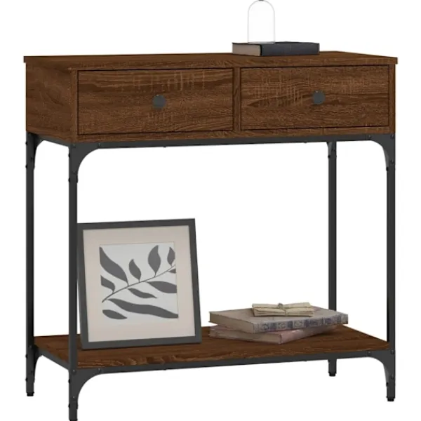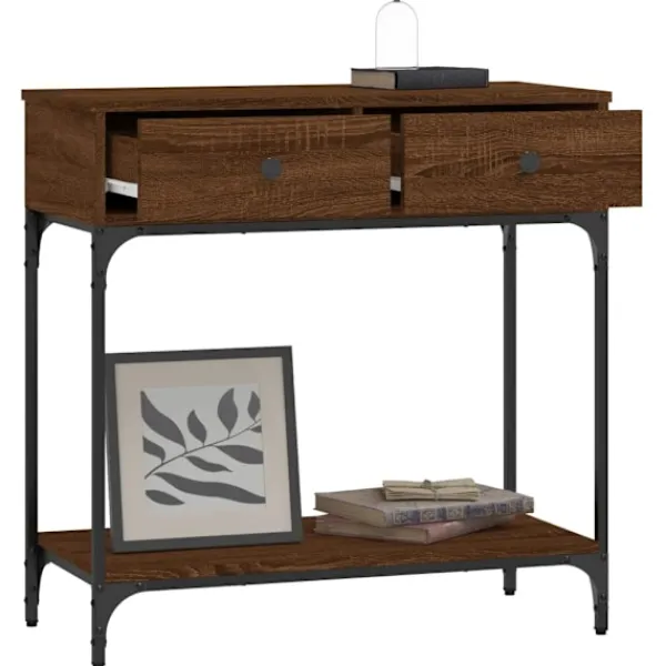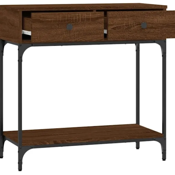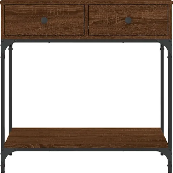 Få en elegant känsla i hallen, vardagsrummet eller entrén med detta snygga avlastningsbord. Slitstarkt material: Hallbordet är tillverkat av konstruerat trä. Det konstruerade träet är av exceptionell kvalitet med slät yta och är också starkt, stabilt och fuktbeständigt.Robust och stabil ram: Trä- och metallramen säkerställer robusthet och stabilitet.Gott om förvaringsutrymme: Soffbordet med lådor har gott om förvaringsutrymme för att hålla dina väsentligheter välorganiserade och inom räckhåll.Robust bordsskiva: Den robusta toppskivan på hallbordet är perfekt för inramade foton, krukväxter och prydnadssaker. Varning:För att förhindra att den välter måste denna produkt användas tillsammans med det medföljande väggfästet.