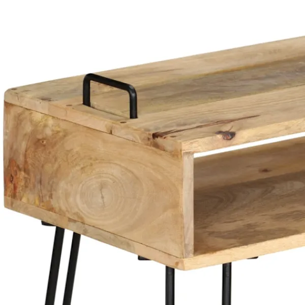 Eftersom bordet är tillverkat i mangoträ och med stadiga stålramar är det mycket stabilt och hållbart. Bordsytan är perfekt för att ställa olika dekorativa föremål såsom vaser och krukväxter. Hyllorna har extra förvaringsplats för att hålla mindre saker organiserade. Stålramarna har en industriell design som gör bordet väldigt stadigt. Varje steg i tillverkningsprocessen utförs med största noggrannhet, från polering till lackering. Monteringen är enkel.
