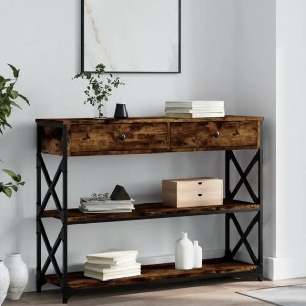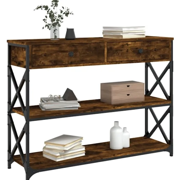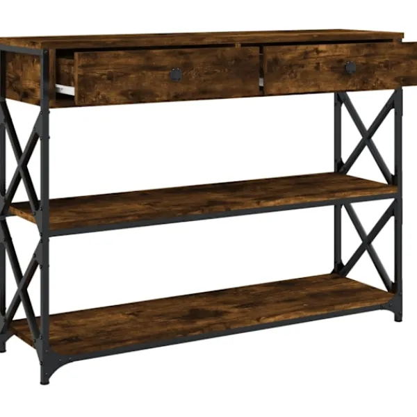 Få en elegant känsla i hallen, vardagsrummet eller entrén med detta snygga avlastningsbord. Hållbart material: Det konstruerade träet är av exceptionell kvalitet med slät yta och är också starkt, stabilt och fuktbeständigt. Med konstruerat trä som byggmaterial är soffbordet lätt att rengöra.Gott om lagringsutrymme: Hallbordet har gott om lagringsutrymme för att hålla dina tidskrifter, böcker och andra dekorativa föremål välorganiserade och inom räckhåll.Justerbara fötter: Fyra justerbara fötter med plasttassar håller hallbordet balanserat på ojämnt underlag och ökar stabiliteten.Metallram: Metallramen lägger till en industriell stil till din interiör samtidigt som den garanterar hållbarhet och stabilitet. Konsolbordet har tvärstänger med X-ram för ökad stabilitet, vilket gör att du inte behöver oroa dig för att den vinglar. Varning:För att förhindra att den välter måste denna produkt användas tillsammans med det medföljande väggfästet.