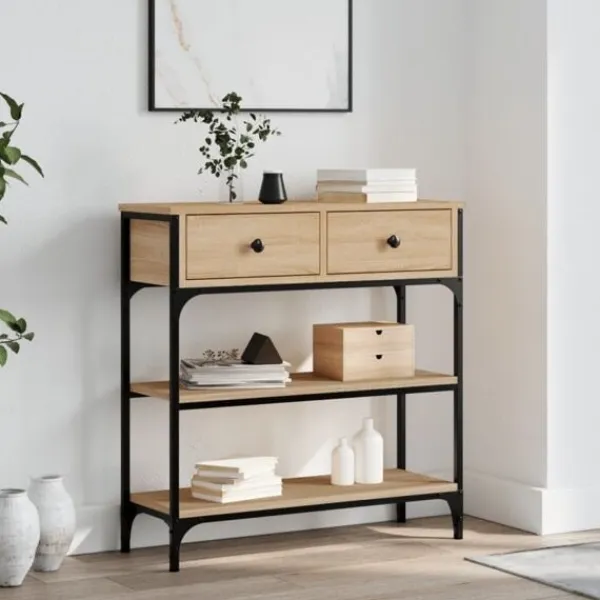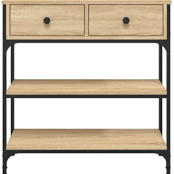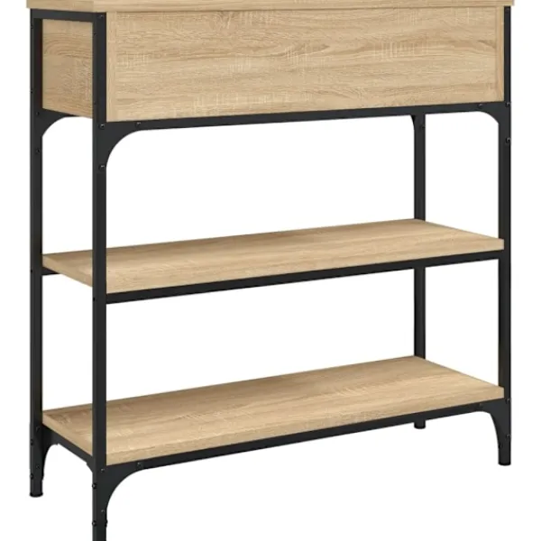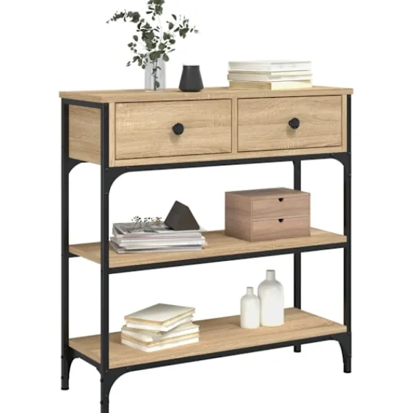 Få en elegant känsla i hallen, vardagsrummet eller entrén med detta snygga avlastningsbord. Hållbart material: Det konstruerade träet är av exceptionell kvalitet med slät yta och är också starkt, stabilt och fuktbeständigt. Med konstruerat trä som byggmaterial är soffbordet lätt att rengöra.Gott om lagringsutrymme: Hallbordet har gott om lagringsutrymme för att hålla dina tidskrifter, böcker och andra dekorativa föremål välorganiserade och inom räckhåll.Justerbara fötter: Fyra justerbara fötter med plasttassar håller hallbordet balanserat på ojämnt underlag och ökar stabiliteten.Metallram: Metallramen lägger till en industriell stil till din interiör samtidigt som den garanterar hållbarhet och stabilitet. Varning:För att förhindra att den välter måste denna produkt användas tillsammans med det medföljande väggfästet.