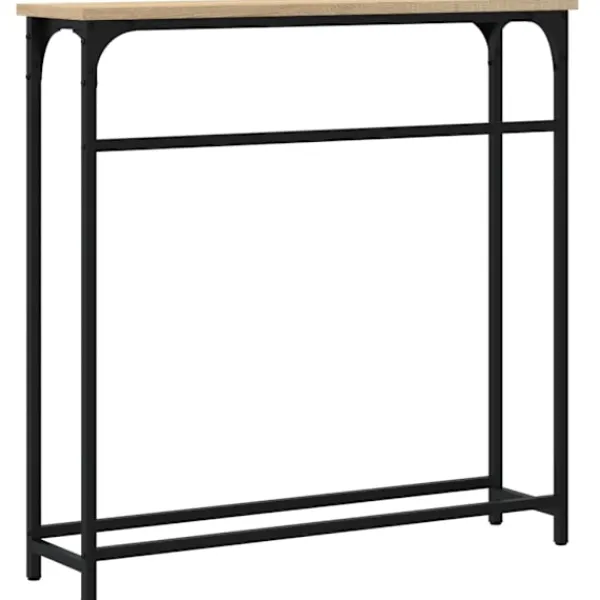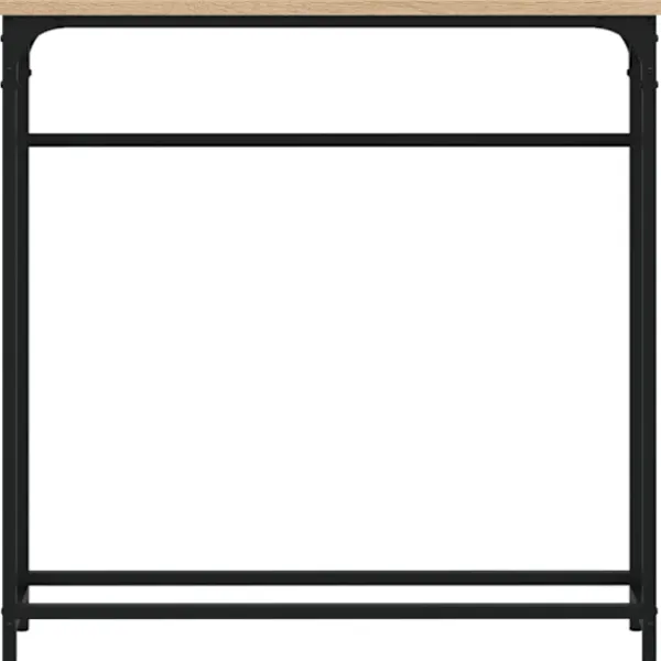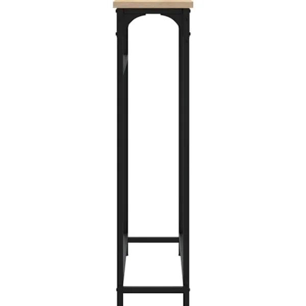 Få en elegant känsla i hallen, vardagsrummet eller entrén med detta snygga avlastningsbord. Hållbart material: Det konstruerade träet är av exceptionell kvalitet med slät yta och är också starkt, stabilt och fuktbeständigt. Med konstruerat trä som byggmaterial är soffbordet lätt att rengöra.Robust bordsskiva: Hallbordet är perfekt för att placera dina inramade foton, krukväxter och andra dekorativa föremål.Justerbara fötter: Fyra justerbara fötter med plasttassar håller hallbordet balanserat på ojämnt underlag och ökar stabiliteten.Metallram: Metallramen lägger till en industriell stil till din interiör samtidigt som den garanterar hållbarhet och stabilitet. Varning:För att förhindra att den välter måste denna produkt användas tillsammans med det medföljande väggfästet.