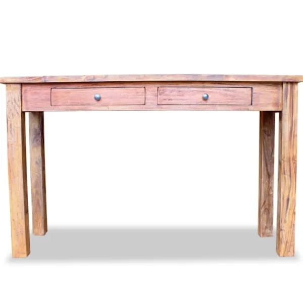Konsolbordet i trä är perfekt om du vill tillföra en känsla av rustik charm till din inredning. Bordet har 2 lådor som tillhandahåller rikligt med förvaringsutrymme. Detta konsolbord är tillverkat i massivt mahognyträ, därmed är det oerhört hållbart och robust. Mahogny är ett tropiskt lövträ som sticker ut med sin skönhet, hållbarhet och färg. Speciellt hantverk har använts för att ge denna artikel ett vintage, varmt och autentiskt utseende. Varje möbel är unik och något annorlunda från nästa. Tecken på slitage ger varje del ett unikt utseende och bidrar till dess spektakulära vintagestil. Eftersom det är tillverkat i återvunnet trä kan produkten uppvisa brister som återspeglar dess autentiska värde och rika historia. Virket kommer från naturligt fallna träd, båtar, trähus m.m. OBS! Färgerna varierar på möblerna vilket gör varje bord unikt; leveransen är slumpartad.