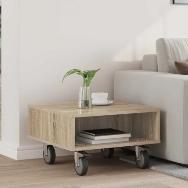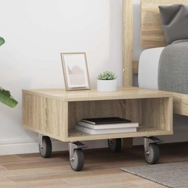 Detta moderna sidobord med hjul är både funktionellt och stiligt, och passar perfekt i vilket vardagsrum som helst. Designat för inomhusbruk, ger det en fräsch känsla till ditt rum med sina rena linjer och minimalistiska stil. Den rektangulära formen smälter lätt in bland möbler, som sängen eller soffan, och har plats för lampor, klockor eller personliga saker. Den konstruerade träytan är både hållbar och snygg och tillför en avslappnad elegans till rummet.