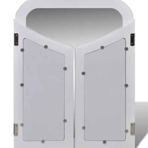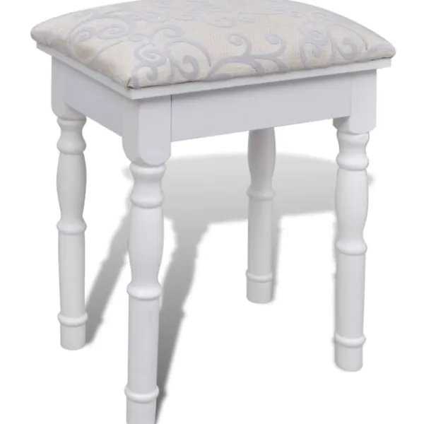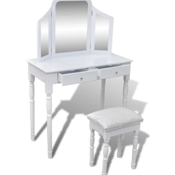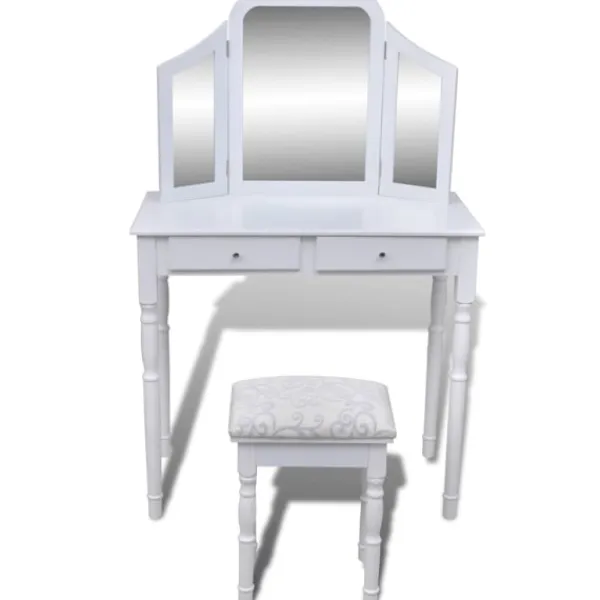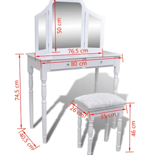 Vårt fina sminkbord med pall är gjort av vitt trä i Viktoriansk stil. Bordet har en stor spegel och två småspeglar som är fästa med gångjärn som gör att du själv kan välja i vilka vinklar du vill ha dem. Speglarna kan även tas bort så att bordet kan användas till annat. Bordet har dessutom två bordslådor där du kan lägga din kosmetika och andra tillbehör. Sminkbordet är enkelt att montera och tillbehören som behövs ingår.