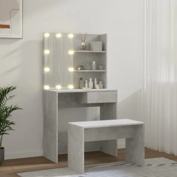 Detta trendiga sminkbord ger ditt sovrum ett tidlöst, elegant utseende. Sminkbordet med LED är ett utmärkt komplement till din sovrumsinredning samtidigt som du har din kosmetika nära till hands! Stabilt material: Det konstruerade träet är av exceptionell kvalitet med slät yta och är också starkt, stabilt och fuktbeständigt.Spegel: Sminkbordet med spegel är perfekt för din dagliga skönhetsrutin. Spegeln låter dig ta hand om din hud och den underlättar när du sminkar dig!Gott om förvaringsutrymme: Sminkbordet med pall har gott om utrymme för enkel åtkomst till smink, smycken och vardagliga nödvändigheter.LED-ljus: Sminkbordet har också LED-lampor med USB, som är enkla att byta läge från varmt till kallvitt. LED-lamporna runt spegeln avger ljus.Breda applikationer: Detta sminkbord är lämpligt för olika scener, till exempel ditt sovrum, garderob och alla andra rum du vill ställa det. VARNING:För att förhindra att den välter måste denna produkt användas med den medföljande monteringsanordningen för vägg Observera:Varje produkt levereras med en monteringsmanual i lådan för enkel montering.