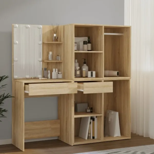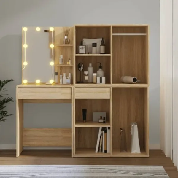 Verkligen enkelt, men ändå funktionellt LED-sminkbord med 2 skåp, matchar olika typer av interiörer. Slitstarkt material: LED-sminkbordet med skåp är tillverkat av konstruerat trä. Det konstruerade träet är av exceptionell kvalitet med slät yta och är också starkt, stabilt och fuktbeständigt.LED-ljus: Sminkbordet med skåp har också LED-lampor med USB, som är enkla att byta läge från varmt till kallvitt. LED-lamporna runt spegeln avger ljus.Gott om förvaringsutrymme: Det 2 förvaringsskåpen har gott om plats, perfekt för att organisera din smink, tillbehör, väskor och skönhetsprodukter. VARNING:För att förhindra att den välter måste denna produkt användas med den medföljande monteringsanordningen för vägg Observera:Varje produkt levereras med en monteringsmanual i lådan för enkel montering.