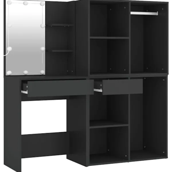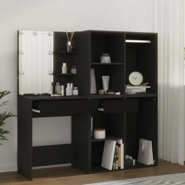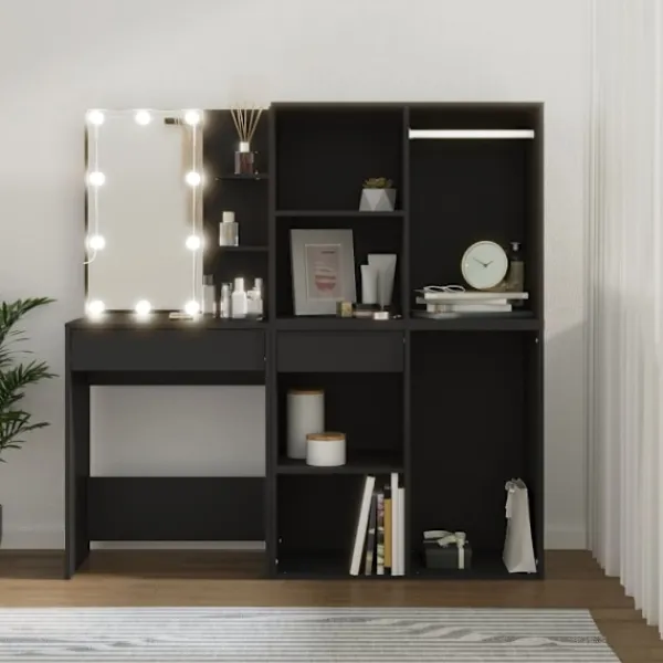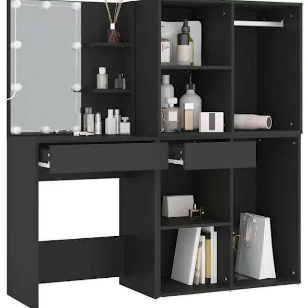 Detta trendiga sminkbord med LED och skåp ger ditt sovrum ett tidlöst, elegant utseende. Sminkbordet med LED är ett utmärkt komplement till din sovrumsinredning samtidigt som du har din kosmetika nära till hands! Stabilt material: Det konstruerade träet är av exceptionell kvalitet med slät yta och är också starkt, stabilt och fuktbeständigt.Spegel: Sminkbordet med spegel är perfekt för din dagliga skönhetsrutin. Spegeln låter dig ta hand om din hud och den underlättar när du sminkar dig!Gott om förvaringsutrymme: Sminkbordet har gott om utrymme för enkel åtkomst till smink, smycken och vardagliga nödvändigheter.LED-ljus: Sminkbordet har också LED-lampor med USB, som är enkla att byta läge från varmt till kallvitt. LED-lamporna runt spegeln avger ljus.Stort användningsområde: Detta sminkbord kan ställas i olika rum, såsom ditt sovrum, badrum eller andra lämpliga platser. VARNING:För att förhindra att den välter måste denna produkt användas tillsammans med det medföljande väggfästet.