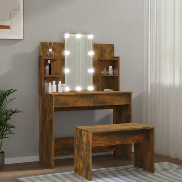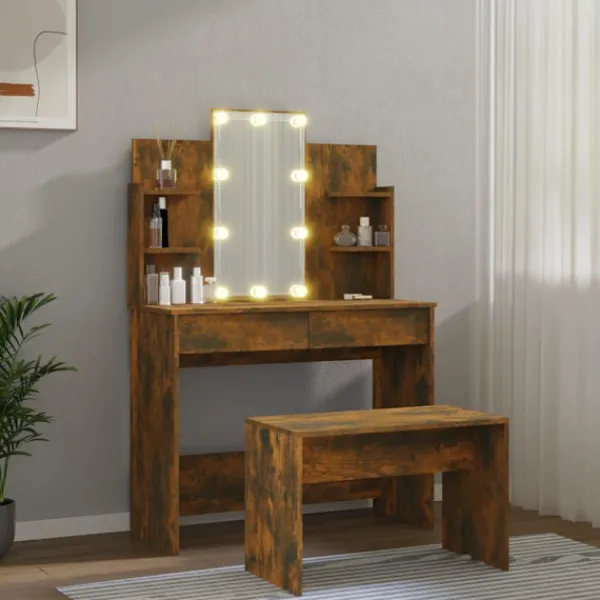 Detta trendiga sminkbord ger ditt sovrum ett tidlöst, elegant utseende. Sminkbordet med LED är ett utmärkt komplement till din sovrumsinredning samtidigt som du har din kosmetika nära till hands! Stabilt material: Det konstruerade träet är av exceptionell kvalitet med slät yta och är också starkt, stabilt och fuktbeständigt.Spegel: Sminkbordet med spegel är perfekt för din dagliga skönhetsrutin. Spegeln låter dig ta hand om din hud och den underlättar när du sminkar dig!Gott om förvaringsutrymme: Sminkbordet med pall har gott om utrymme för enkel åtkomst till smink, smycken och vardagliga nödvändigheter.LED-ljus: Sminkbordet har också LED-lampor med USB, som är enkla att byta läge från varmt till kallvitt. LED-lamporna runt spegeln avger ljus.Breda applikationer: Detta sminkbord är lämpligt för olika scener, till exempel ditt sovrum, garderob och alla andra rum du vill ställa det. VARNING:För att förhindra att den välter måste denna produkt användas med den medföljande monteringsanordningen för vägg Observera:Varje produkt levereras med en monteringsmanual i lådan för enkel montering.