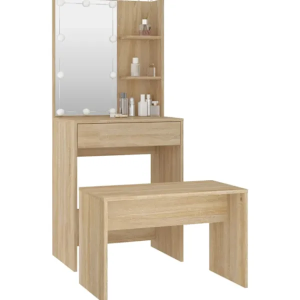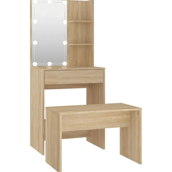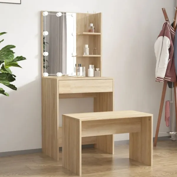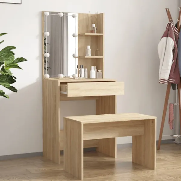 Detta trendiga sminkbord ger ditt sovrum ett tidlöst, elegant utseende. Sminkbordet med LED är ett utmärkt komplement till din sovrumsinredning samtidigt som du har din kosmetika nära till hands! Stabilt material: Det konstruerade träet är av exceptionell kvalitet med slät yta och är också starkt, stabilt och fuktbeständigt.Spegel: Sminkbordet med spegel är perfekt för din dagliga skönhetsrutin. Spegeln låter dig ta hand om din hud och den underlättar när du sminkar dig!Gott om förvaringsutrymme: Sminkbordet med pall har gott om utrymme för enkel åtkomst till smink, smycken och vardagliga nödvändigheter.LED-ljus: Sminkbordet har också LED-lampor med USB, som är enkla att byta läge från varmt till kallvitt. LED-lamporna runt spegeln avger ljus.Breda applikationer: Detta sminkbord är lämpligt för olika scener, till exempel ditt sovrum, garderob och alla andra rum du vill ställa det. VARNING:För att förhindra att den välter måste denna produkt användas med den medföljande monteringsanordningen för vägg Observera:Varje produkt levereras med en monteringsmanual i lådan för enkel montering.