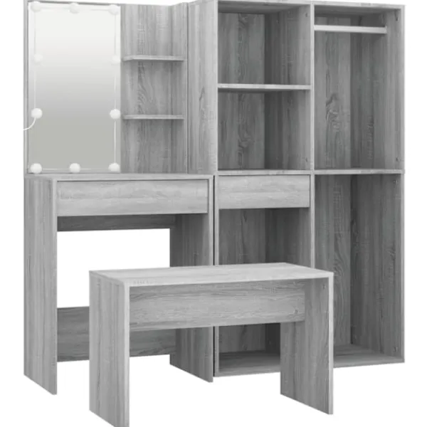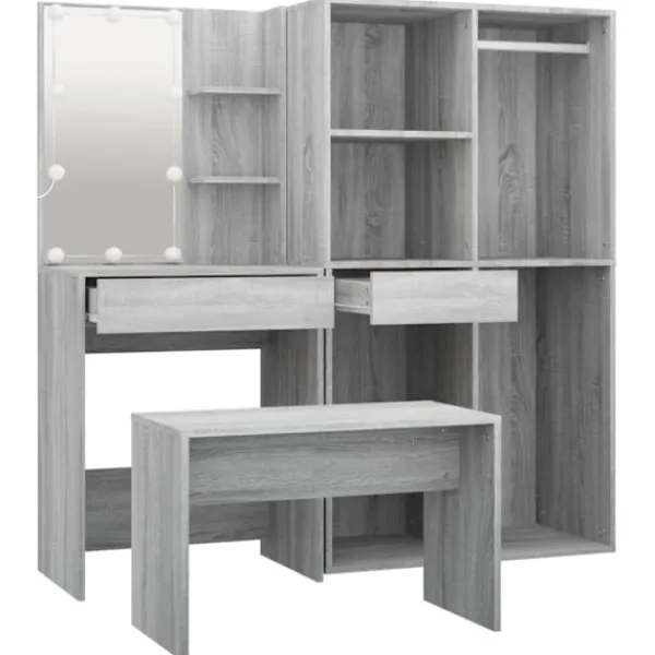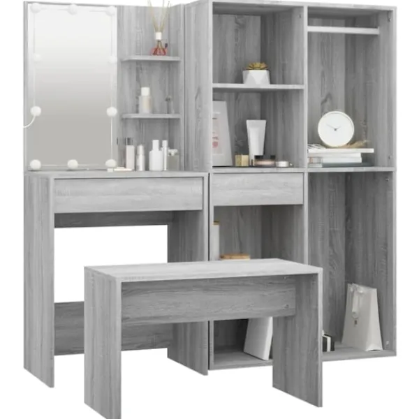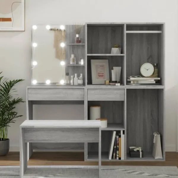 Detta trendiga sminkbord ger ditt sovrum ett tidlöst, elegant utseende. Sminkbordet med LED är ett utmärkt komplement till din sovrumsinredning samtidigt som du har din kosmetika nära till hands! Stabilt material: Det konstruerade träet är av exceptionell kvalitet med slät yta och är också starkt, stabilt och fuktbeständigt.Spegel: Sminkbordet med spegel är perfekt för din dagliga skönhetsrutin. Spegeln låter dig ta hand om din hud och den underlättar när du sminkar dig!Gott om förvaringsutrymme: Sminkbordet med pall har gott om utrymme för enkel åtkomst till smink, smycken och vardagliga nödvändigheter.LED-ljus: Sminkbordet har också LED-lampor med USB, som är enkla att byta läge från varmt till kallvitt. LED-lamporna runt spegeln avger ljus.Breda applikationer: Detta sminkbord är lämpligt för olika scener, till exempel ditt sovrum, garderob och alla andra rum du vill ställa det. VARNING:För att förhindra att den välter måste denna produkt användas med den medföljande monteringsanordningen för vägg Observera:Varje produkt levereras med en monteringsmanual i lådan för enkel montering.