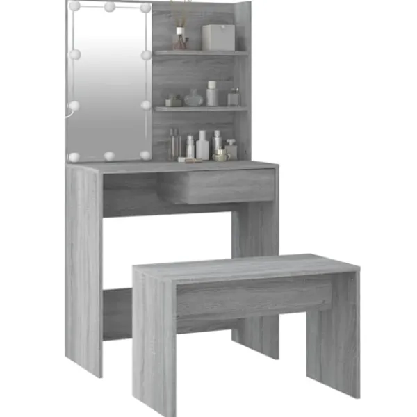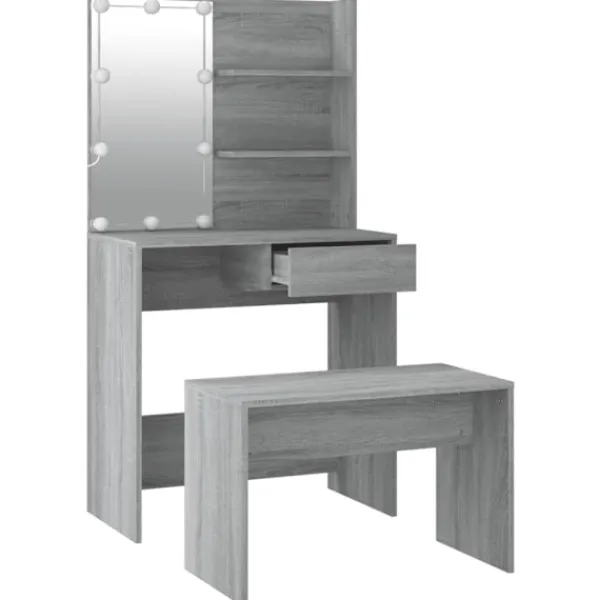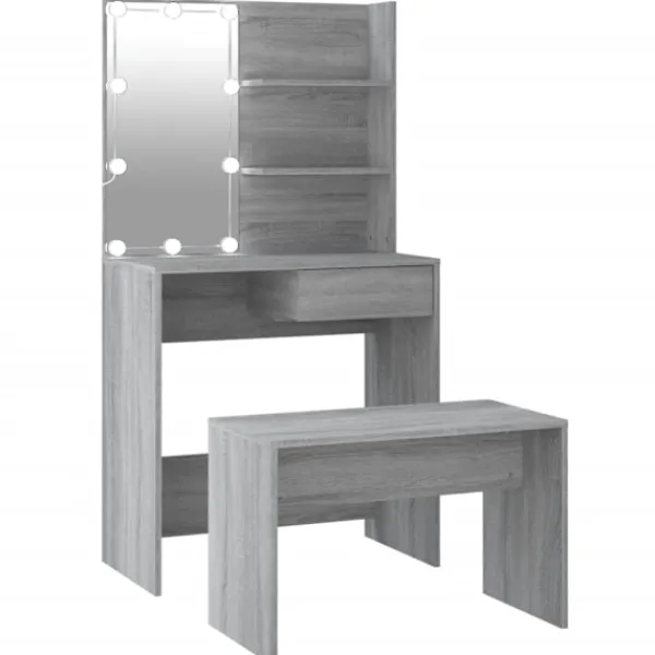 Detta trendiga sminkbord ger ditt sovrum ett tidlöst, elegant utseende. Sminkbordet med LED är ett utmärkt komplement till din sovrumsinredning samtidigt som du har din kosmetika nära till hands! Stabilt material: Det konstruerade träet är av exceptionell kvalitet med slät yta och är också starkt, stabilt och fuktbeständigt.Spegel: Sminkbordet med spegel är perfekt för din dagliga skönhetsrutin. Spegeln låter dig ta hand om din hud och den underlättar när du sminkar dig!Gott om förvaringsutrymme: Sminkbordet med pall har gott om utrymme för enkel åtkomst till smink, smycken och vardagliga nödvändigheter.LED-ljus: Sminkbordet har också LED-lampor med USB, som är enkla att byta läge från varmt till kallvitt. LED-lamporna runt spegeln avger ljus.Breda applikationer: Detta sminkbord är lämpligt för olika scener, till exempel ditt sovrum, garderob och alla andra rum du vill ställa det. VARNING:För att förhindra att den välter måste denna produkt användas med den medföljande monteringsanordningen för vägg Observera:Varje produkt levereras med en monteringsmanual i lådan för enkel montering.