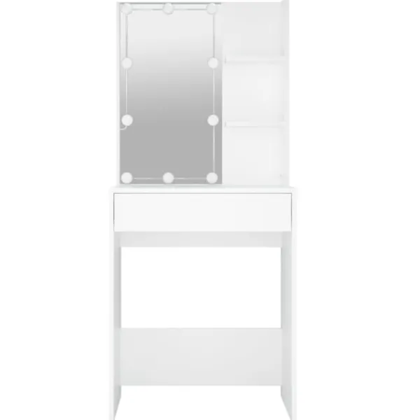 Detta sminkbord blir ett riktigt blickfång i din inredning, tack vare dess raka linjer och asymmetriska form. Hållbart material: Det konstruerade träet är av exceptionell kvalitet med slät yta och är också starkt, stabilt och fuktbeständigt.LED-ljus: Sminkbordet har också LED-lampor med USB, som är enkla att byta läge från varmt till kallvitt. LED-lamporna runt spegeln avger ljus.Gott om förvaringsutrymme: Den rymliga lådan och två öppna hyllorna har tillräckligt med förvaring för att organisera dina föremål och även göra ditt rum städat och rent.VARNING:För att förhindra att den välter måste denna produkt användas med den medföljande monteringsanordningen för vägg Observera:Varje produkt levereras med en monteringsmanual i lådan för enkel montering.