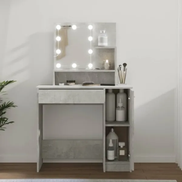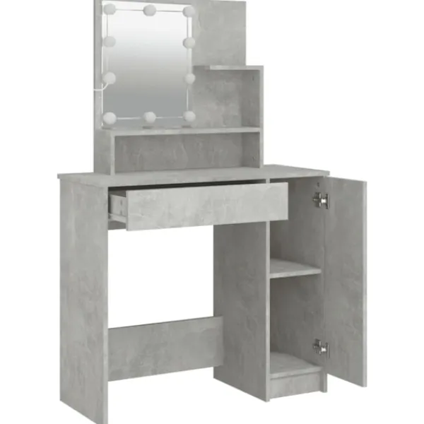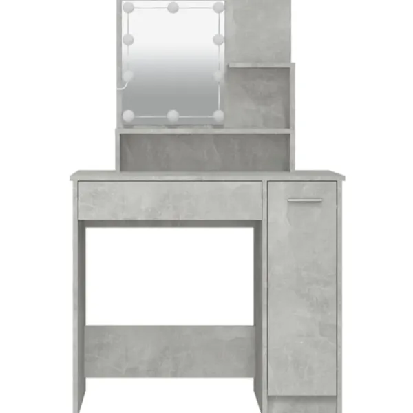 Detta sminkbord blir ett riktigt blickfång i din inredning, tack vare dess raka linjer och asymmetriska form. Hållbart material: Det konstruerade träet är av exceptionell kvalitet med slät yta och är också starkt, stabilt och fuktbeständigt.LED-ljus: Sminkbordet har också LED-lampor med USB, som är enkla att byta läge från varmt till kallvitt. LED-lamporna runt spegeln avger ljus.Gott om förvaringsutrymme: Detta sminkbord har öppna hyllor på bordet, en låda och ett sidoskåp, med gott om förvaringsutrymme för att hålla väsentligheter välorganiserade och inom räckhåll. VARNING:För att förhindra att den välter måste denna produkt användas med den medföljande monteringsanordningen för vägg Observera:Varje produkt levereras med en monteringsmanual i lådan för enkel montering.