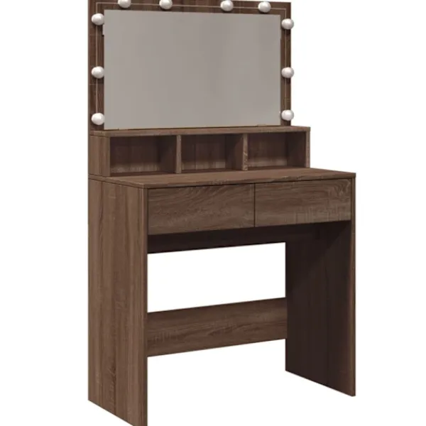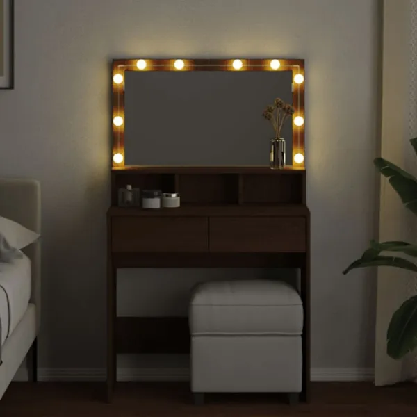 - LED-belysning: Sminkbordet har också LED-lampor med USB, som lätt kan ändra läge från varmt till kallvitt. LED-lamporna runt spegeln ger dig gott om ljus.