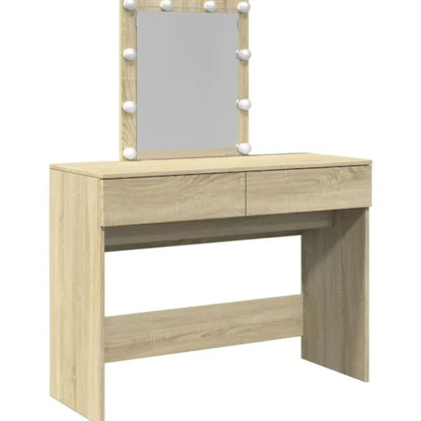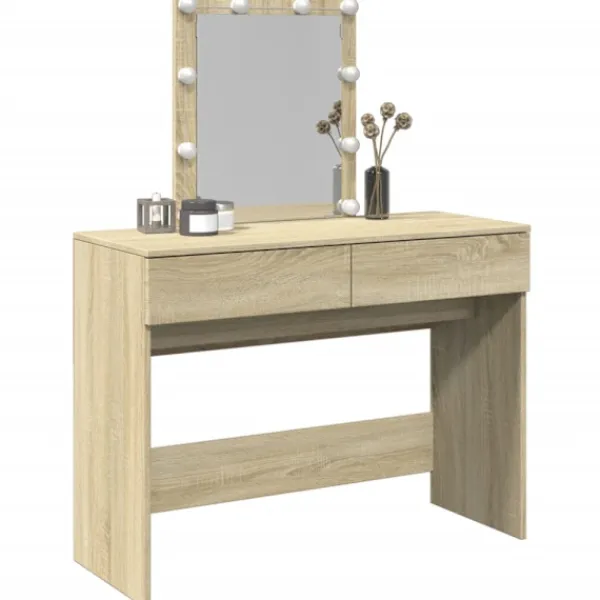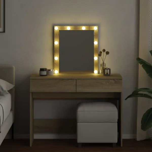 - LED-belysning: Sminkbordet har också LED-lampor med USB, som lätt kan ändra läge från varmt till kallvitt. LED-lamporna runt spegeln ger dig gott om ljus.