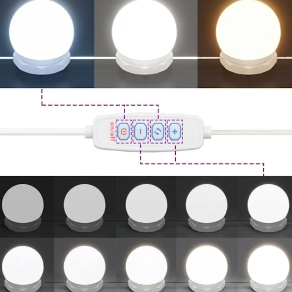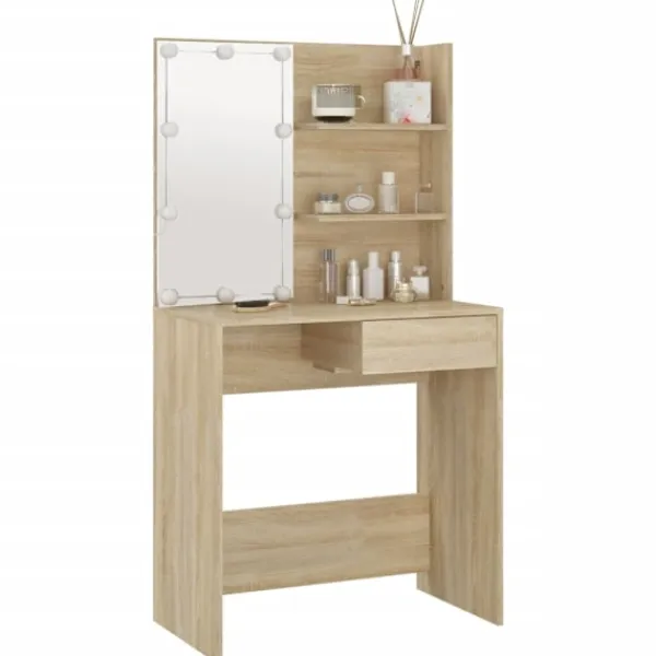 Detta sminkbord blir ett riktigt blickfång i din inredning, tack vare dess raka linjer och asymmetriska form. Hållbart material: Det konstruerade träet är av exceptionell kvalitet med slät yta och är också starkt, stabilt och fuktbeständigt.LED-ljus: Sminkbordet har också LED-lampor med USB, som är enkla att byta läge från varmt till kallvitt. LED-lamporna runt spegeln avger ljus.Gott om förvaringsutrymme: Sminkbordet levereras med en förvaringslåda för att lagra dina tillbehör, tillsammans med två öppna hyllor på bordet för att lagra alla typer av flaskor. VARNING:För att förhindra att den välter måste denna produkt användas med den medföljande monteringsanordningen för vägg Observera:Varje produkt levereras med en monteringsmanual i lådan för enkel montering.