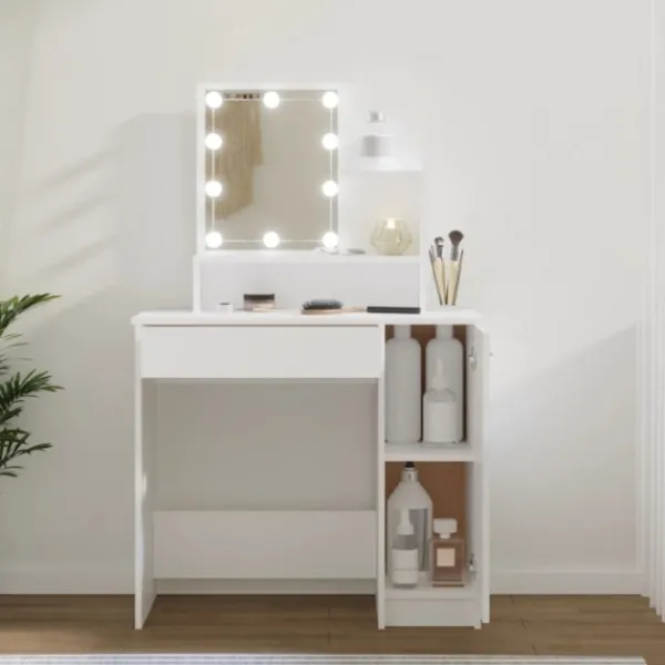 - Gott om förvaringsutrymme: Detta sminkbord har öppna hyllor på bordet, en låda och ett sidoskåp, med gott om förvaringsutrymme för att hålla väsentligheter välorganiserade och inom räckhåll.