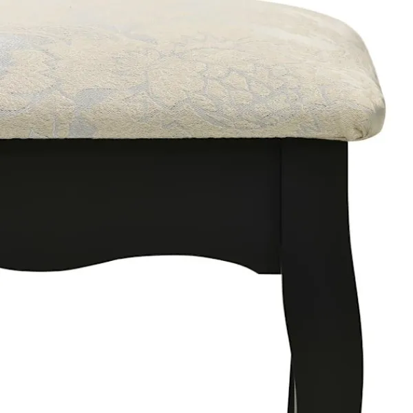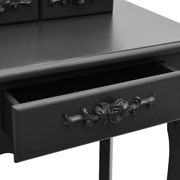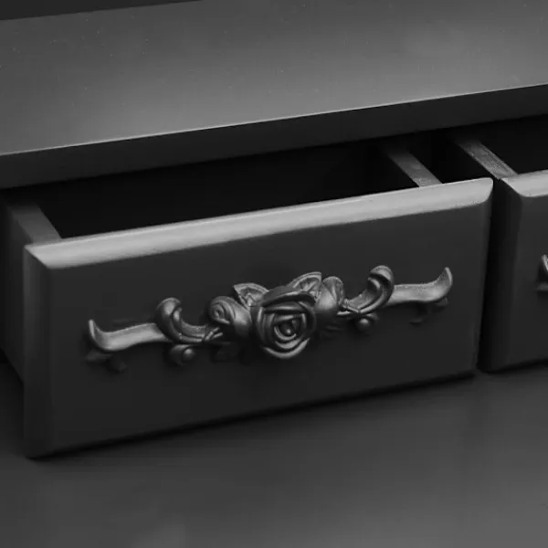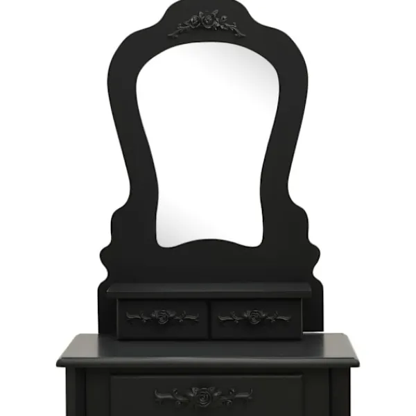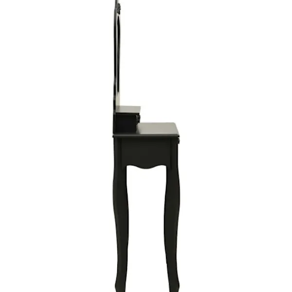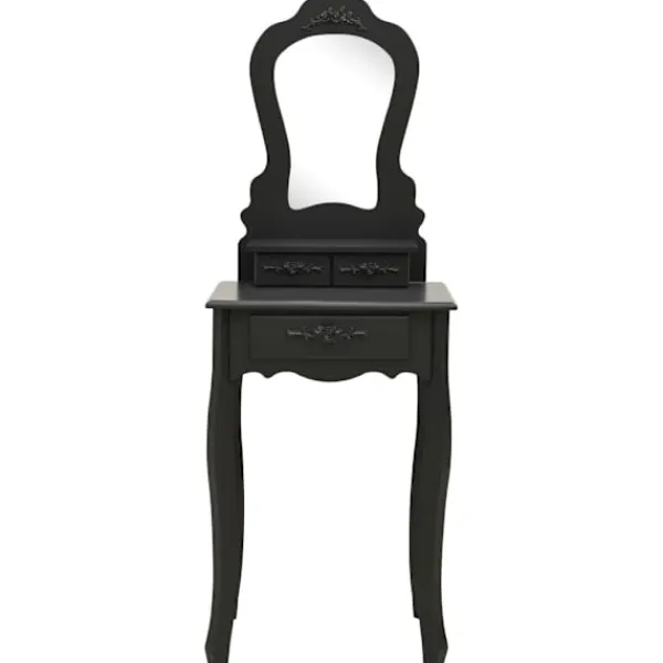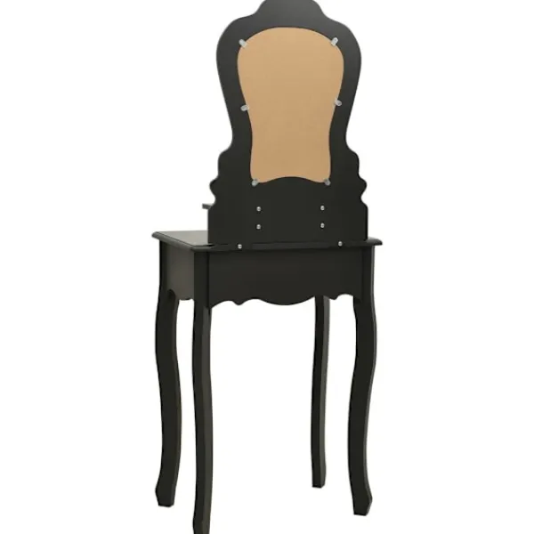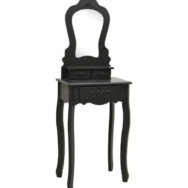 Utför din morgonrutin i stil med vårt eleganta och charmiga sminkbord! Detta sminkbord tillverkat i paulowniaträ är en fin möbel tack vare dess lyxiga stil. Dess tre olika lådor erbjuder gott om plats för förvaring av smink och smycken. Bordsskivan är också en utmärkt plattform för att ställa parfymer eller liknande. Den medföljande pallen har en vadderad sits och en matchande bas i trä. Dessutom har den inbyggda speglar.