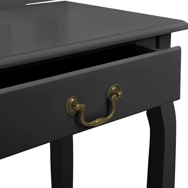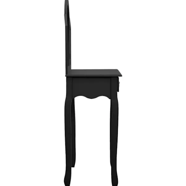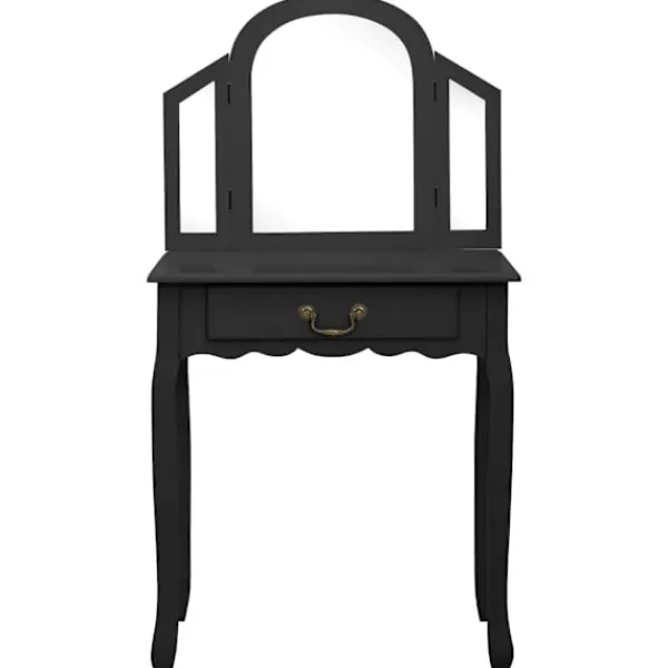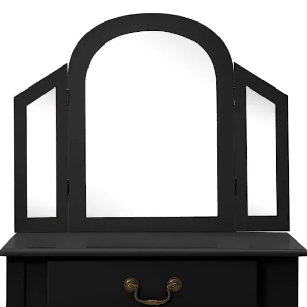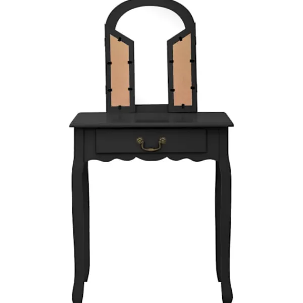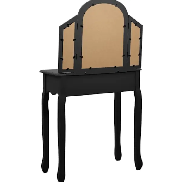 Vårt lyxiga sminkbord med pall är den perfekta platsen att sminka dig på morgonen och förbereda dig för dagen. Det har även fantastiska förvaringsmöjligheter för dina smycken och andra skönhetssaker. Sminkbordet med oval spegel och en pall blir ett riktigt blickfång i sovrummet. Lådan har gott om plats att förvara smink som du använder varje dag på et prydligt sätt. Pallen med tjock stoppning låter dig sitta bekvämt när du gör dig i ordning. När den inte används kan pallen förvaras under bordet för att spara plats. Dessutom är bordet hållbart och lätt att underhålla.