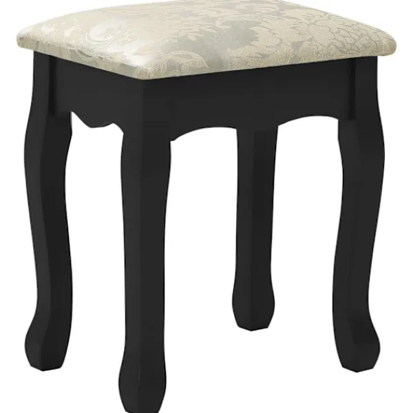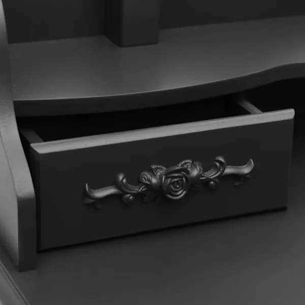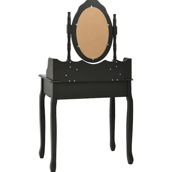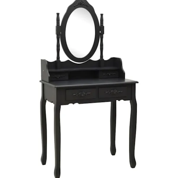 Utför din morgonrutin i stil med vårt eleganta och charmiga sminkbord! Detta sminkbord tillverkat i paulowniaträ är en fin möbel tack vare dess lyxiga stil. Dess fyra olika lådor och öppna fack erbjuder gott om plats för förvaring av smink och smycken. Bordsskivan är också en utmärkt plattform för att ställa parfymer eller liknande. Den medföljande pallen har en vadderad sits och en matchande bas i trä. Dessutom har den inbyggda speglar.