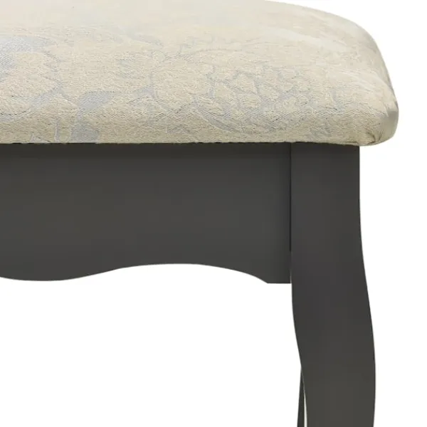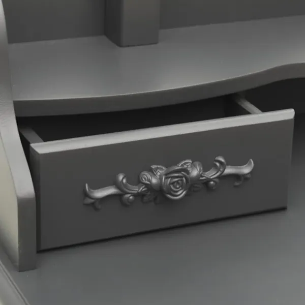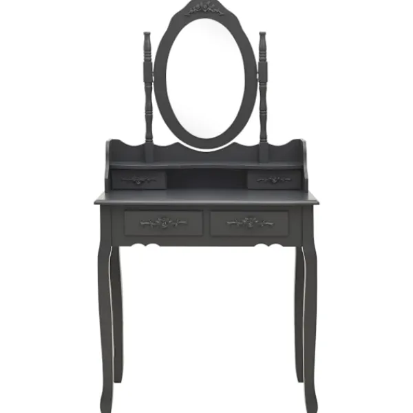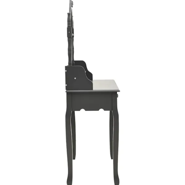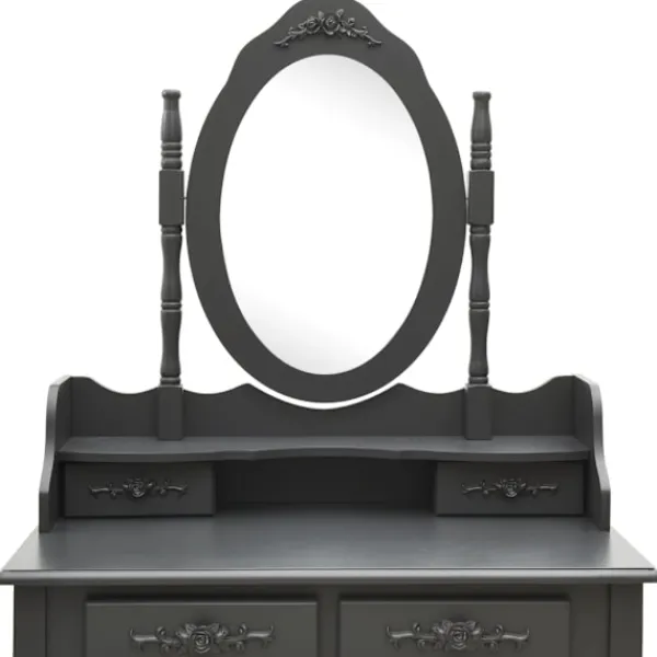 Utför din morgonrutin i stil med vårt eleganta och charmiga sminkbord! Detta sminkbord tillverkat i paulowniaträ är en fin möbel tack vare dess lyxiga stil. Dess fyra olika lådor och öppna fack erbjuder gott om plats för förvaring av smink och smycken. Bordsskivan är också en utmärkt plattform för att ställa parfymer eller liknande. Den medföljande pallen har en vadderad sits och en matchande bas i trä. Dessutom har den inbyggda speglar.