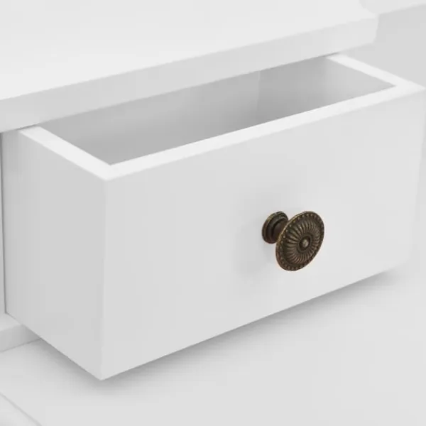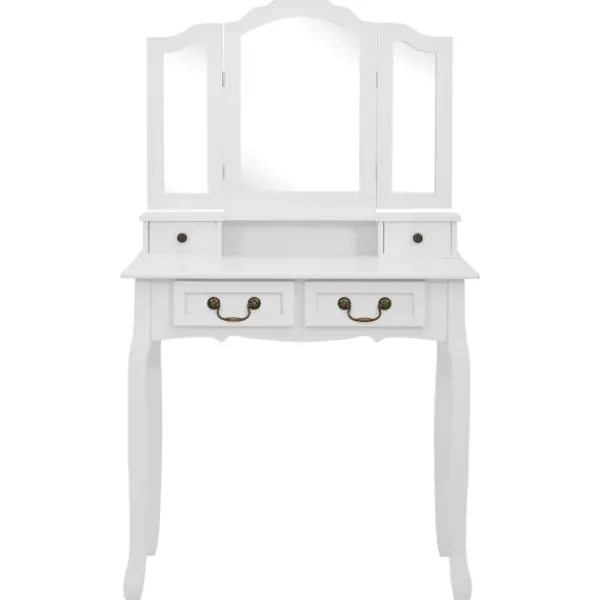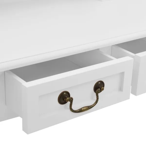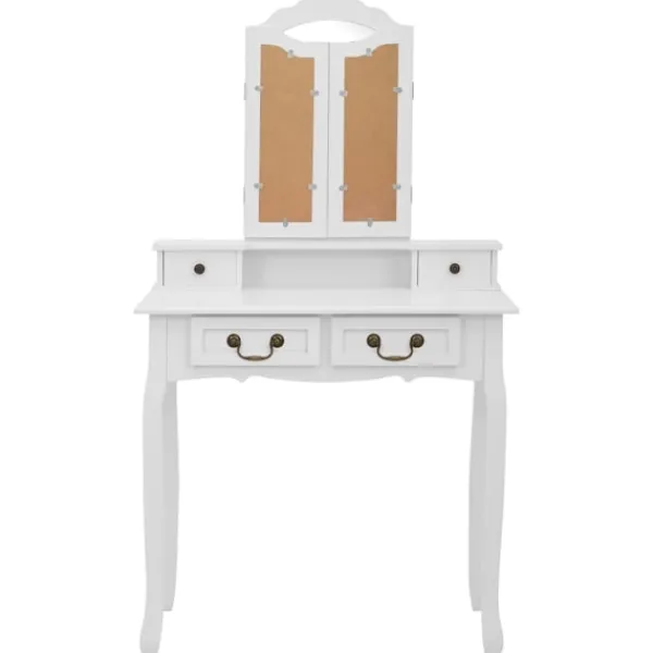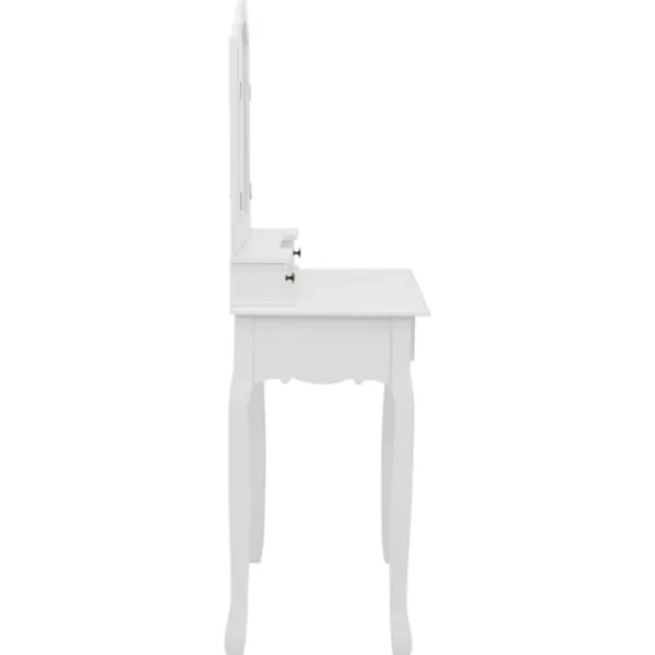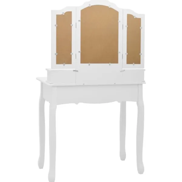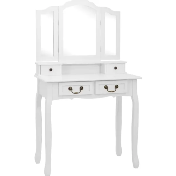 Utför din morgonrutin i stil med vårt eleganta och charmiga sminkbord! Detta sminkbord tillverkat i paulowniaträ är en fin möbel tack vare dess lyxiga stil. Dess fyra olika lådor och öppna fack erbjuder gott om plats för förvaring av smink och smycken. Bordsskivan är också en utmärkt plattform för att ställa parfymer eller liknande. Den medföljande pallen har en vadderad sits och en matchande bas i trä. Dessutom har den inbyggda speglar.