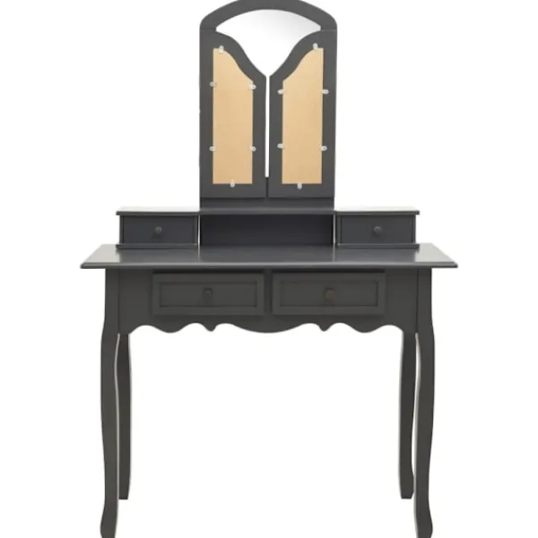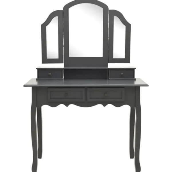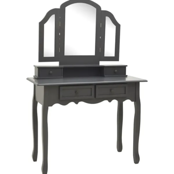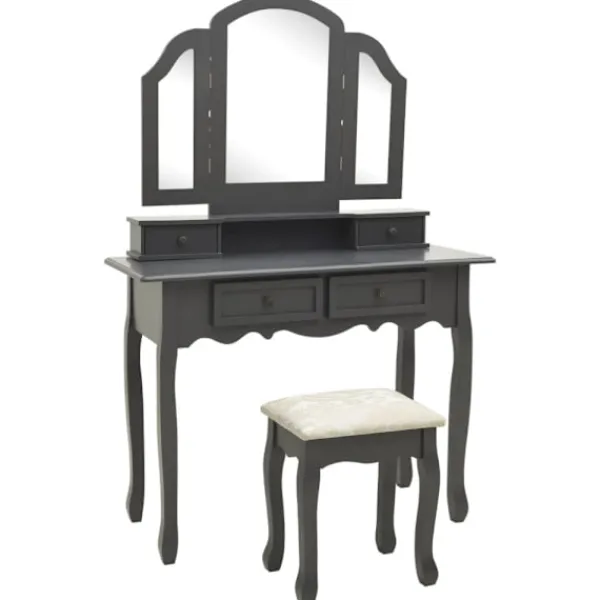 Detta charmiga sminkbord med tillhörande pall är tillverkat i högkvalitativt paulowniaträ. Dess viktorianska stil och rena, gråa finish tillför ett stänk av elegans och skönhet till din budoar, salong eller ditt omklädningsrum. Det utsökta hantverket är ännu en enastående egenskap hos denna uppsättning med bord och pall.