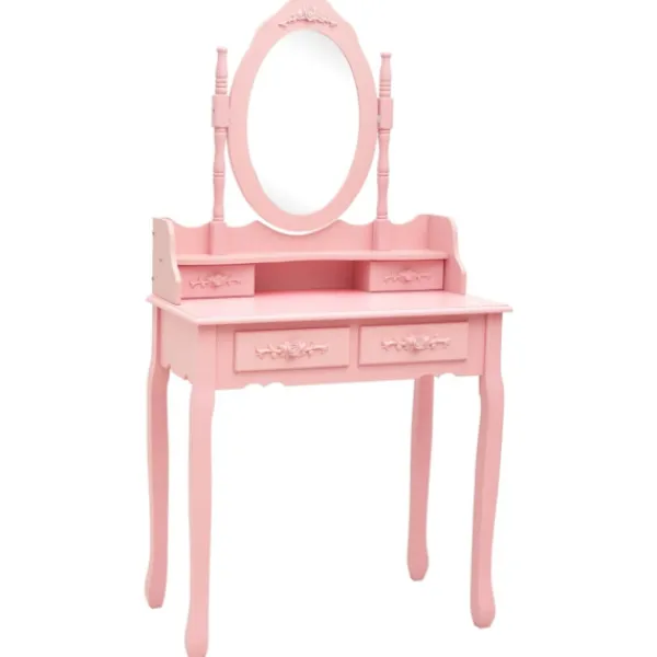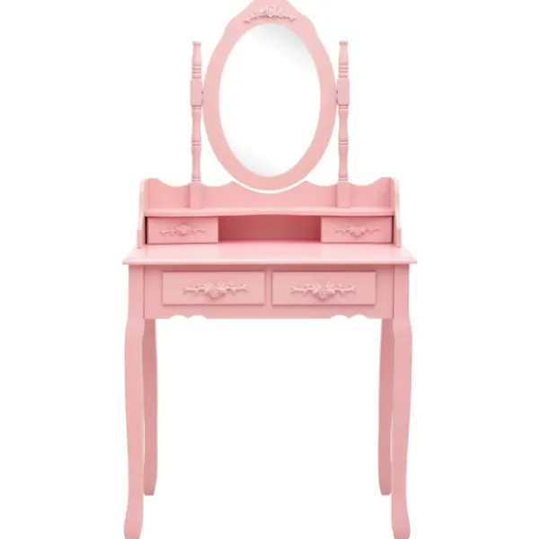 Detta sminkbord tillverkat i paulowniaträ är en fin möbel tack vare dess lyxiga stil. Dess fyra olika lådor och öppna fack erbjuder gott om plats för förvaring av smink och smycken. Bordsskivan är också en utmärkt plattform för att ställa parfymer eller liknande. Den medföljande pallen har en vadderad sits och en matchande bas i trä. Dessutom har den inbyggda speglar.