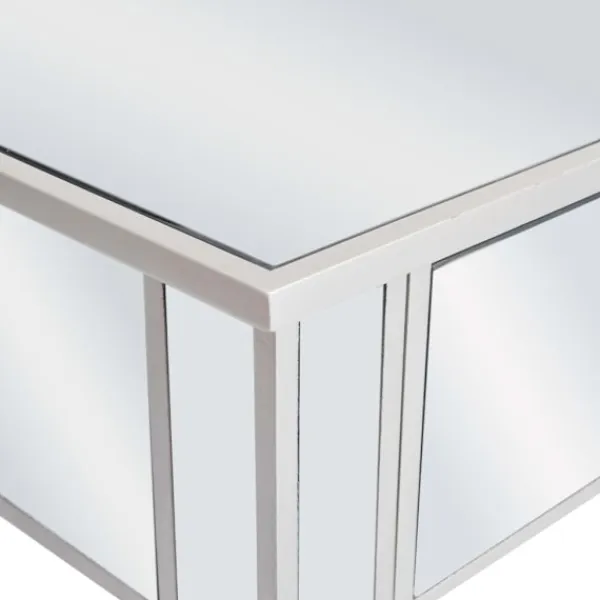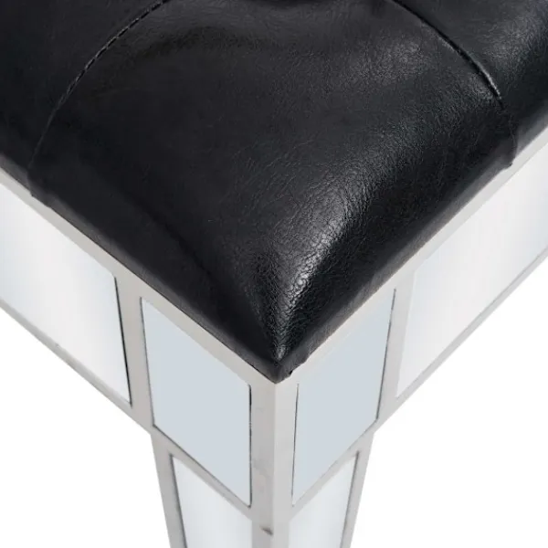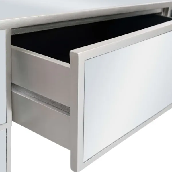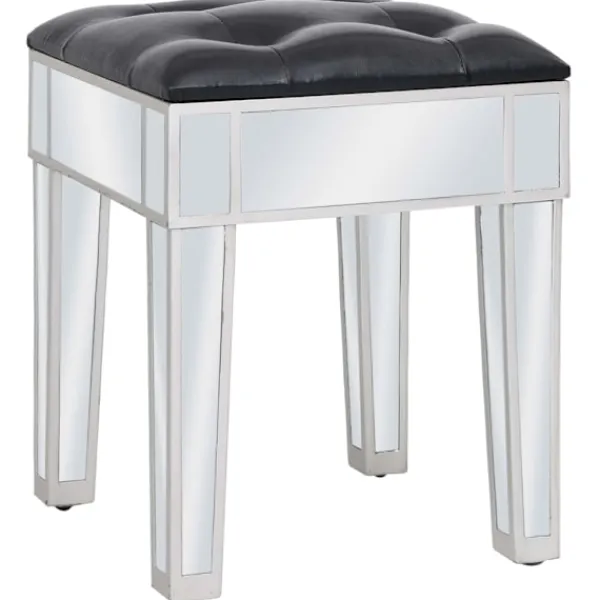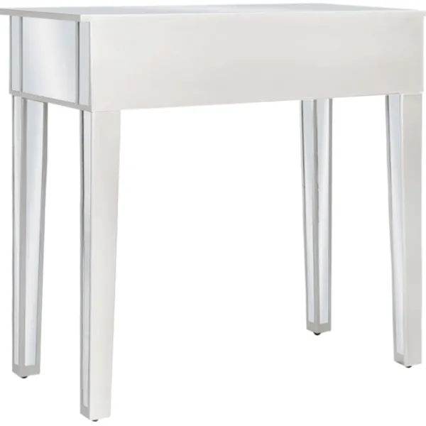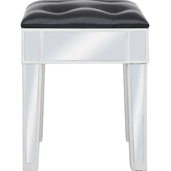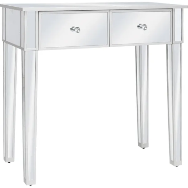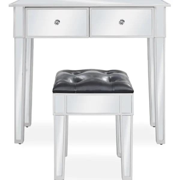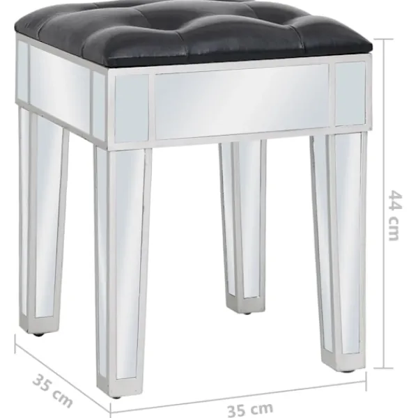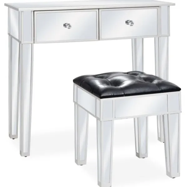 Det speglade sminkbordet med pall ger din inredning en känsla av elegans. Sminkbordet är smyckat med speglat glas och utstrålar en sofistikerad atmosfär. Sminkbordet med pall har en stadig ram i MDF. De två lådorna har gott om plats för att hålla olika mindre föremål organiserade och inom räckhåll. Sminkbordet kan också användas som avlastningsbord, hallbord, skrivbord med mera. Tack vare dess speglade yta blir detta bord en vacker detalj i din inredning och hjälper dig att få en rymlig känsla. Knopparna i konstkristall utstrålar en elegant charm och gör det lättsamt att öppna lådorna. Sitsen är klädd i konstläder för att ge dig optimal komfort och en lyxig känsla. Bordet och pallen är lätta att montera.